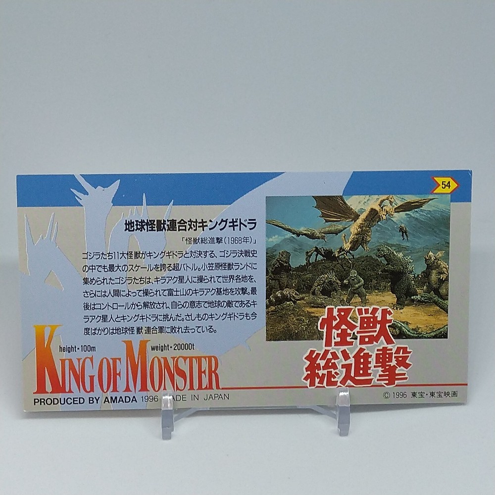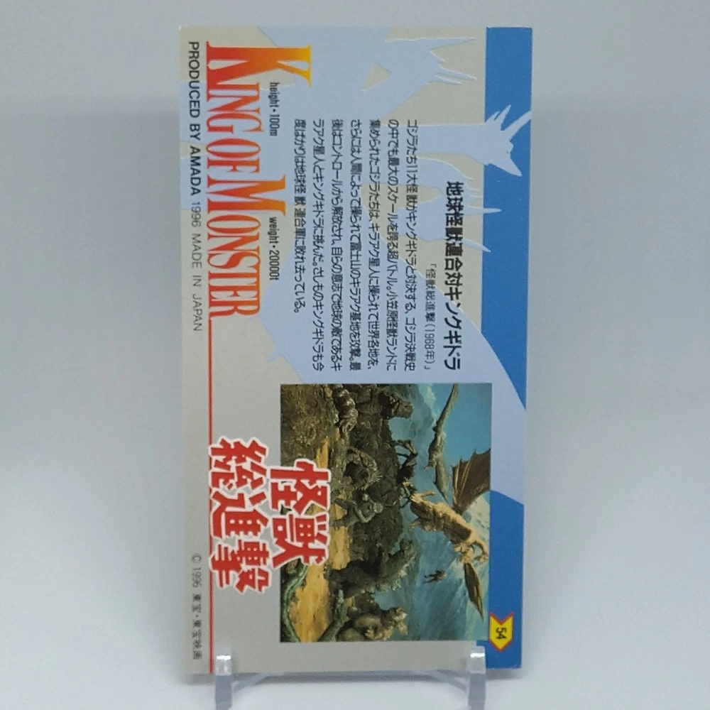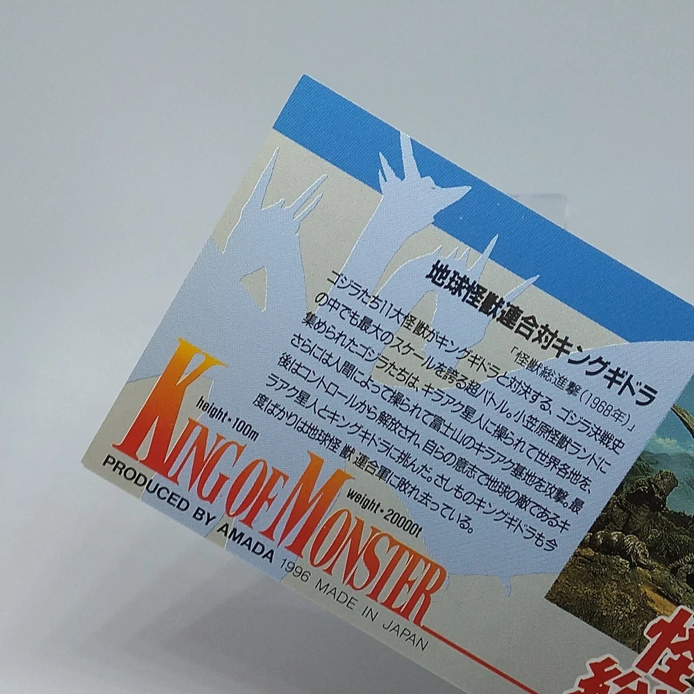 Godzilla King Ghidorah King of Monster Amada Wide Collection Card No.54 1996 Description Please see the picture for the details of damages and dirt or ask us before your purchase. 100% Authentic or Money Back Guaranteed. (Do not worry you are protected by eBay and eBay Managed Payments) See the pictures for more details. If you have any question about the condition, accessories, or anything about the product, please feel free to message us. We are glad to answer all your concerns. Payment Same as ebay payment method. Shipping Economy shipping: Delivery time will be about 11 - 23 days. Standard shipping: Delivery time will be about 5 - 10 days. Expedited shipping: Delivery time will be about 1 - 4 days. Terms of Sale Money back guarantee within 30 days if returned by customer. We would not be able to accept your bid if you; 1) Don't have a PayPal account. 2) Have unpaid items reported. 3) Have a primary shipping address in countries you don't ship to. 4) Have reportedly violated eBay policies. 5) Have a Feedback score lower than the number you specify. International Buyers - Please Note: Import duties, taxes and charges are not included in the item price or shipping charges. These charges are the buyer's responsibility. Please check with your country's customs office to determine what these additional costs will be prior to bidding/buying. These charges are normally collected by the delivering freight (shipping) company or when you pick the item up - do not confuse them for additional shipping charges.