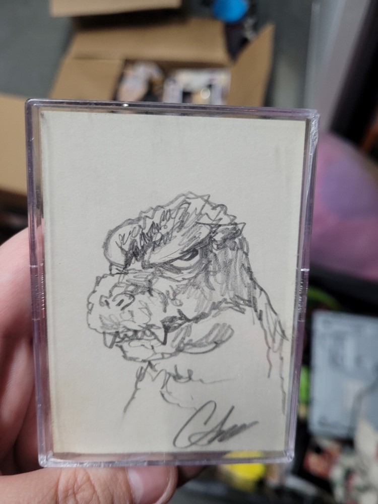 This Godzilla sketch card is a must-have for any serious collector! The artwork is stunning, and it's been perfectly preserved in its hard case with only minor edge wear. The sketch itself is flawless, making it a rare and valuable piece from the 2006 set. A true gem for fans of the King of the Monsters!