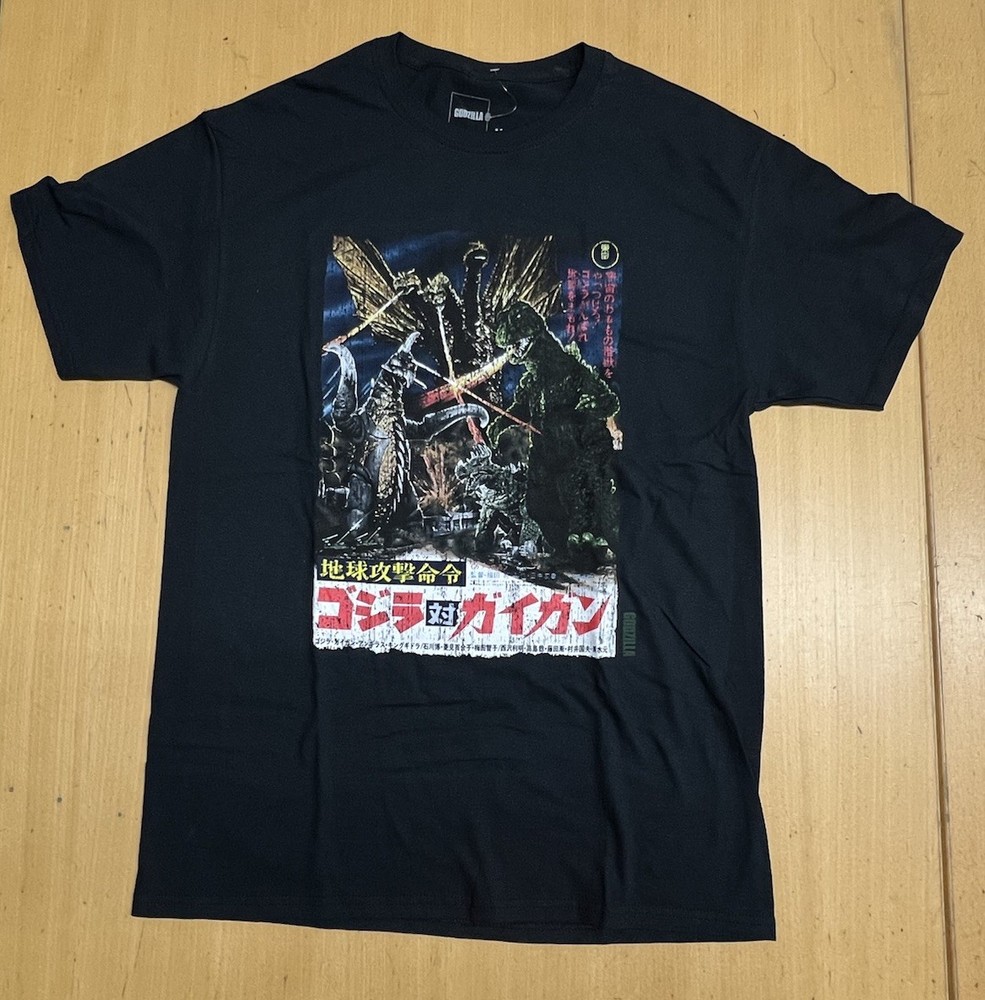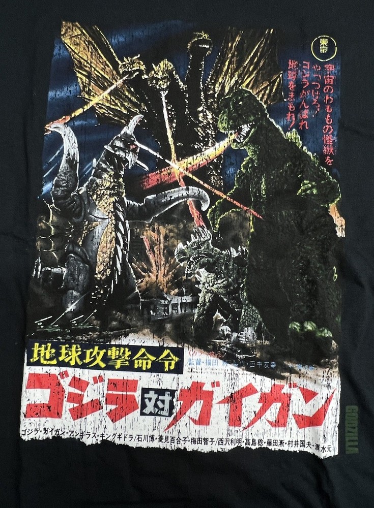The product is a Godzilla King of the Monsters Japanese movie theater poster card T-shirt from the brand Toho. It features a regular fit, short sleeves, and is in size M. The black T-shirt showcases a theme inspired by the Japanese monster movie, making it a must-have for fans of the iconic franchise. Perfect for men who appreciate quality and unique clothing pieces that reflect their love for pop culture legends like Godzilla.