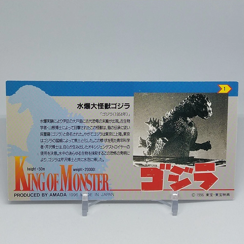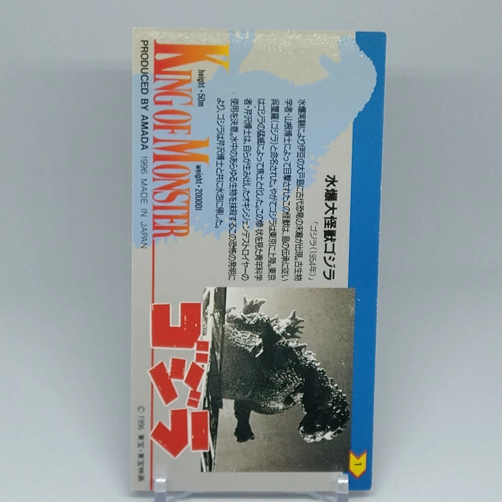 Godzilla King of Monster Amada Wide Collection Trading Card No.1 Holo 1996 Description Please see the picture for the details of damages and dirt or ask us before your purchase. 100% Authentic or Money Back Guaranteed. (Do not worry you are protected by eBay and eBay Managed Payments) See the pictures for more details. If you have any question about the condition, accessories, or anything about the product, please feel free to message us. We are glad to answer all your concerns. Payment Same as ebay payment method. Shipping Economy shipping: Delivery time will be about 11 - 23 days. Standard shipping: Delivery time will be about 5 - 10 days. Expedited shipping: Delivery time will be about 1 - 4 days. Terms of Sale Money back guarantee within 30 days if returned by customer. We would not be able to accept your bid if you; 1) Don't have a PayPal account. 2) Have unpaid items reported. 3) Have a primary shipping address in countries you don't ship to. 4) Have reportedly violated eBay policies. 5) Have a Feedback score lower than the number you specify. International Buyers - Please Note: Import duties, taxes and charges are not included in the item price or shipping charges. These charges are the buyer's responsibility. Please check with your country's customs office to determine what these additional costs will be prior to bidding/buying. These charges are normally collected by the delivering freight (shipping) company or when you pick the item up - do not confuse them for additional shipping charges.