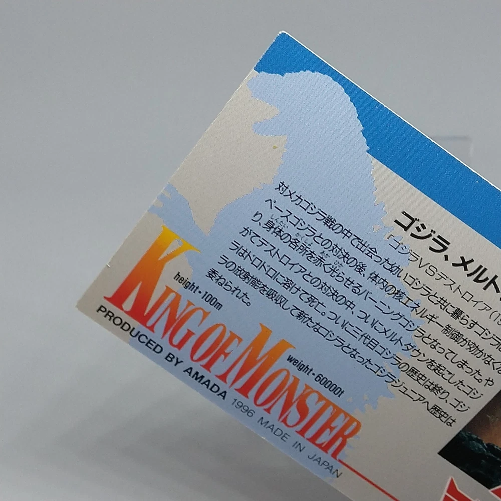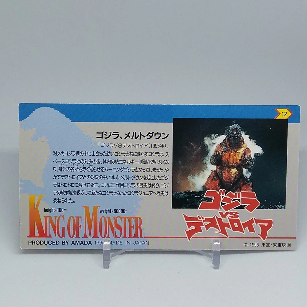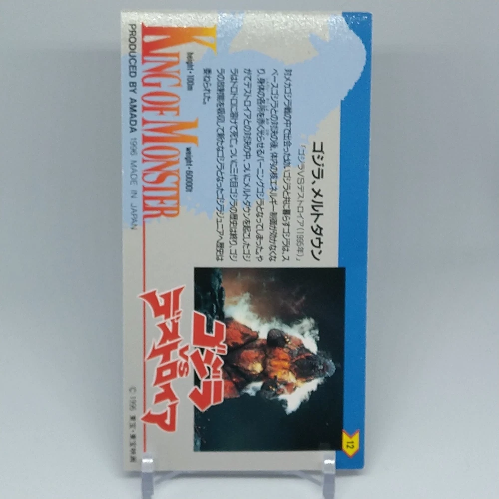 Godzilla King of Monster Amada Wide Collection Trading Card No.12 Holo 1996 Description Please see the picture for the details of damages and dirt or ask us before your purchase. 100% Authentic or Money Back Guaranteed. (Do not worry you are protected by eBay and eBay Managed Payments) See the pictures for more details. If you have any question about the condition, accessories, or anything about the product, please feel free to message us. We are glad to answer all your concerns. Payment Same as ebay payment method. Shipping Economy shipping: Delivery time will be about 11 - 23 days. Standard shipping: Delivery time will be about 5 - 10 days. Expedited shipping: Delivery time will be about 1 - 4 days. Terms of Sale Money back guarantee within 30 days if returned by customer. We would not be able to accept your bid if you; 1) Don't have a PayPal account. 2) Have unpaid items reported. 3) Have a primary shipping address in countries you don't ship to. 4) Have reportedly violated eBay policies. 5) Have a Feedback score lower than the number you specify. International Buyers - Please Note: Import duties, taxes and charges are not included in the item price or shipping charges. These charges are the buyer's responsibility. Please check with your country's customs office to determine what these additional costs will be prior to bidding/buying. These charges are normally collected by the delivering freight (shipping) company or when you pick the item up - do not confuse them for additional shipping charges.