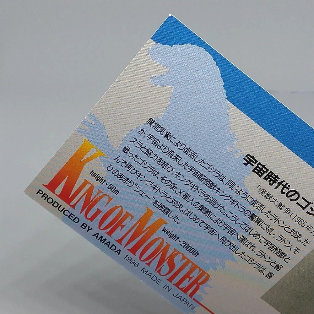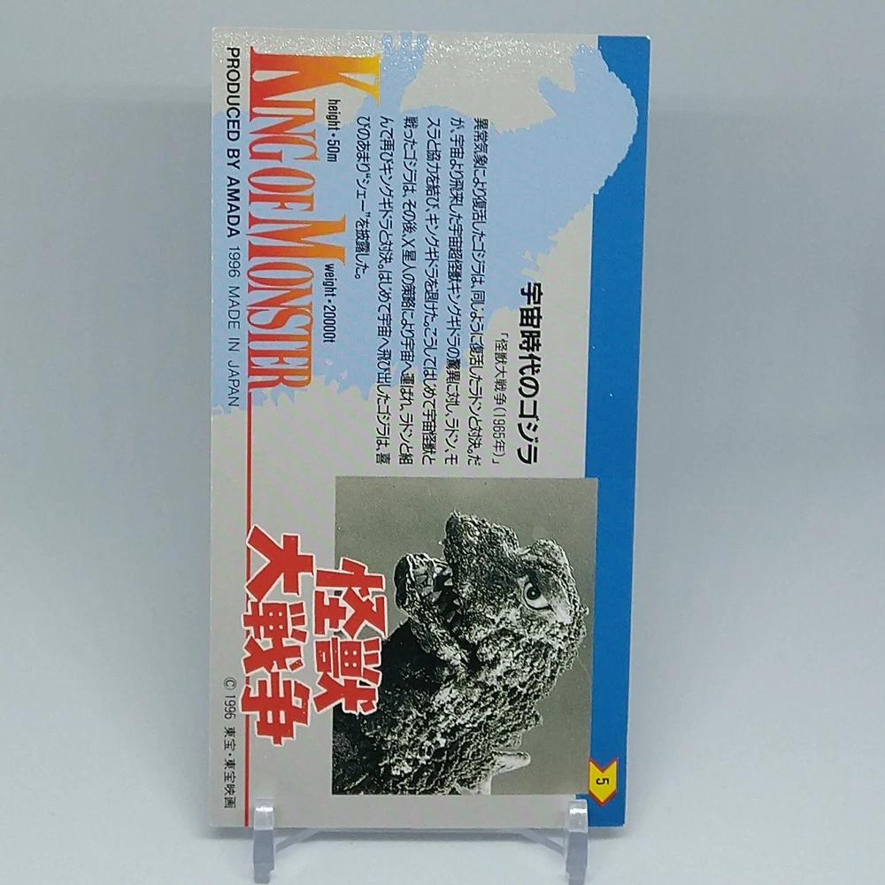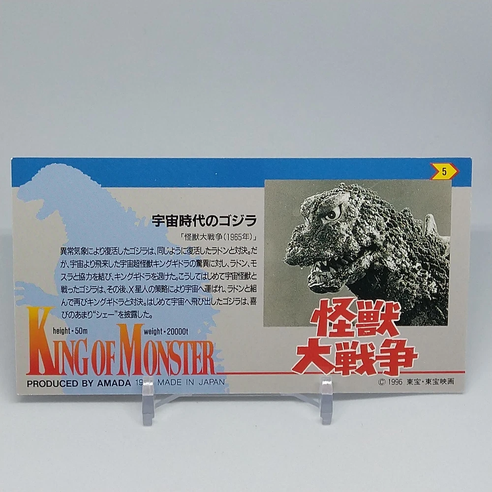 Godzilla King of Monster Amada Wide Collection Trading Card No.5 Holo 1996 Description Please see the picture for the details of damages and dirt or ask us before your purchase. 100% Authentic or Money Back Guaranteed. (Do not worry you are protected by eBay and eBay Managed Payments) See the pictures for more details. If you have any question about the condition, accessories, or anything about the product, please feel free to message us. We are glad to answer all your concerns. Payment Same as ebay payment method. Shipping Economy shipping: Delivery time will be about 11 - 23 days. Standard shipping: Delivery time will be about 5 - 10 days. Expedited shipping: Delivery time will be about 1 - 4 days. Terms of Sale Money back guarantee within 30 days if returned by customer. We would not be able to accept your bid if you; 1) Don't have a PayPal account. 2) Have unpaid items reported. 3) Have a primary shipping address in countries you don't ship to. 4) Have reportedly violated eBay policies. 5) Have a Feedback score lower than the number you specify. International Buyers - Please Note: Import duties, taxes and charges are not included in the item price or shipping charges. These charges are the buyer's responsibility. Please check with your country's customs office to determine what these additional costs will be prior to bidding/buying. These charges are normally collected by the delivering freight (shipping) company or when you pick the item up - do not confuse them for additional shipping charges.