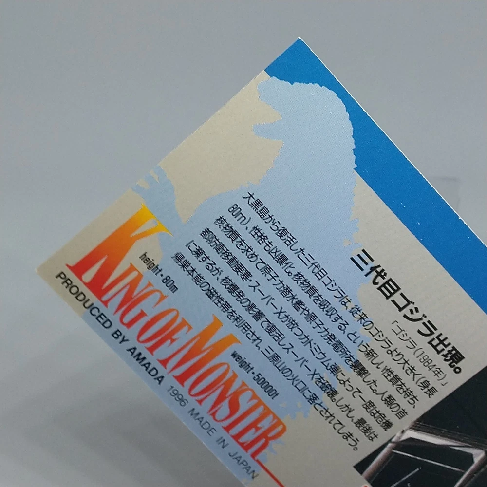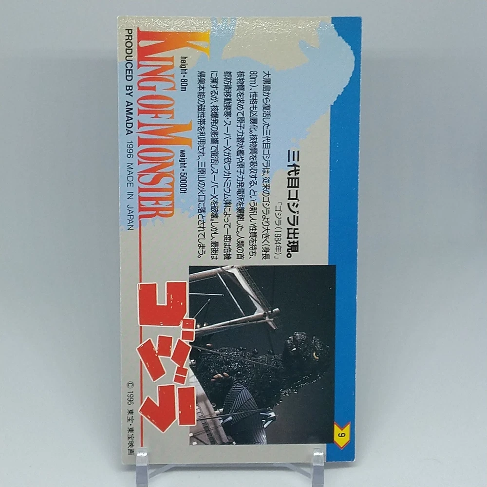 Godzilla King of Monster Amada Wide Collection Trading Card No.9 Holo 1996 Description Please see the picture for the details of damages and dirt or ask us before your purchase. 100% Authentic or Money Back Guaranteed. (Do not worry you are protected by eBay and eBay Managed Payments) See the pictures for more details. If you have any question about the condition, accessories, or anything about the product, please feel free to message us. We are glad to answer all your concerns. Payment Same as ebay payment method. Shipping Economy shipping: Delivery time will be about 11 - 23 days. Standard shipping: Delivery time will be about 5 - 10 days. Expedited shipping: Delivery time will be about 1 - 4 days. Terms of Sale Money back guarantee within 30 days if returned by customer. We would not be able to accept your bid if you; 1) Don't have a PayPal account. 2) Have unpaid items reported. 3) Have a primary shipping address in countries you don't ship to. 4) Have reportedly violated eBay policies. 5) Have a Feedback score lower than the number you specify. International Buyers - Please Note: Import duties, taxes and charges are not included in the item price or shipping charges. These charges are the buyer's responsibility. Please check with your country's customs office to determine what these additional costs will be prior to bidding/buying. These charges are normally collected by the delivering freight (shipping) company or when you pick the item up - do not confuse them for additional shipping charges.