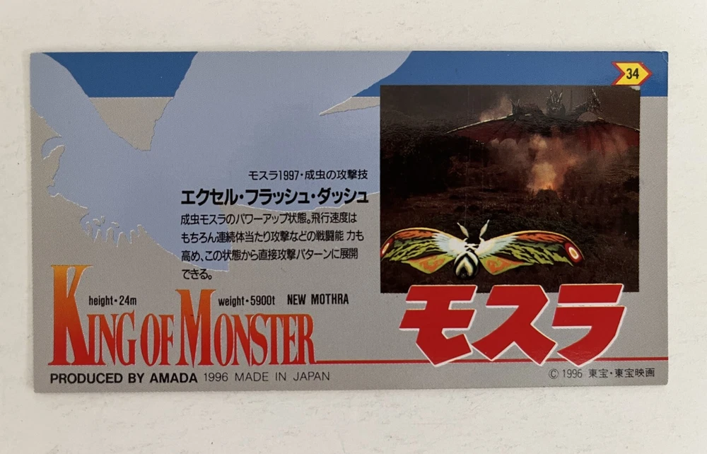Godzilla King of Monster Widevision non-sport trading card (Amada, 1996). #34, Mothra. Card size 4 5/8" x 2 3/8". NM condition. From a smoke-free home. I combine shipping for multiple purchases. Please add the items you wish to purchase to your cart, and request a combined shipping total. Please do not pay until you receive a new invoice. Combined shipping cost will depend on the total weight of the package and the destination.