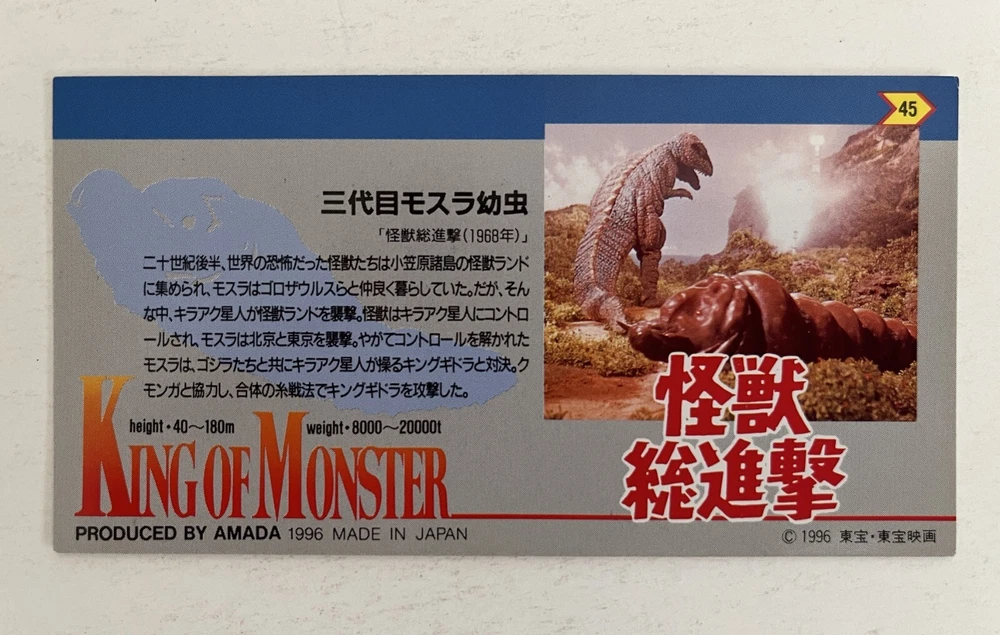 Godzilla King of Monster Widevision non-sport trading card (Amada, 1996). #45, Third generation Mothra larva. Card size 4 5/8" x 2 3/8". NM condition. From a smoke-free home. I combine shipping for multiple purchases. Please add the items you wish to purchase to your cart, and request a combined shipping total. Please do not pay until you receive a new invoice. Combined shipping cost will depend on the total weight of the package and the destination.