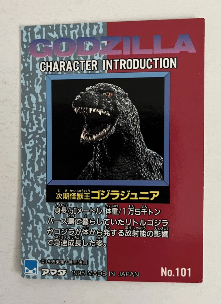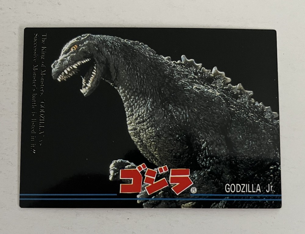 Godzilla King of Monsters, Japanese non-sport trading card (Amada, 1995). #101, Godzilla Jr. Ex/NM condition. From a smoke-free home. I combine shipping for multiple purchases. Please add the items you wish to purchase to your cart, and request a combined shipping total. Please do not pay until you receive a new invoice. Combined shipping cost will depend on the total weight of the package and the destination.
