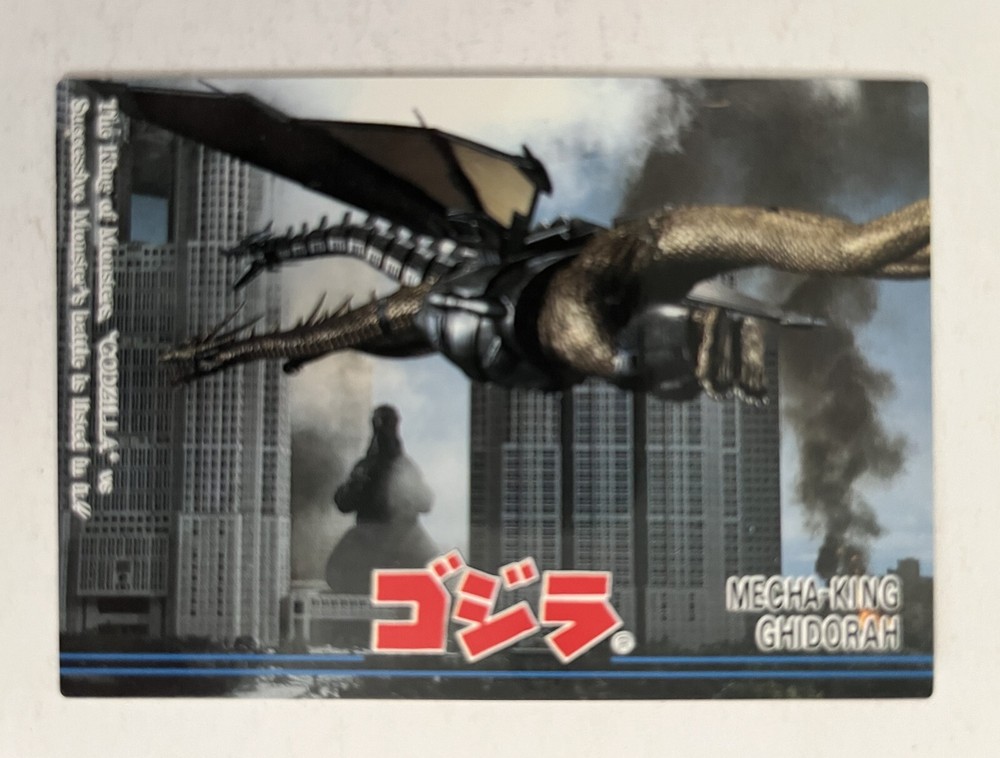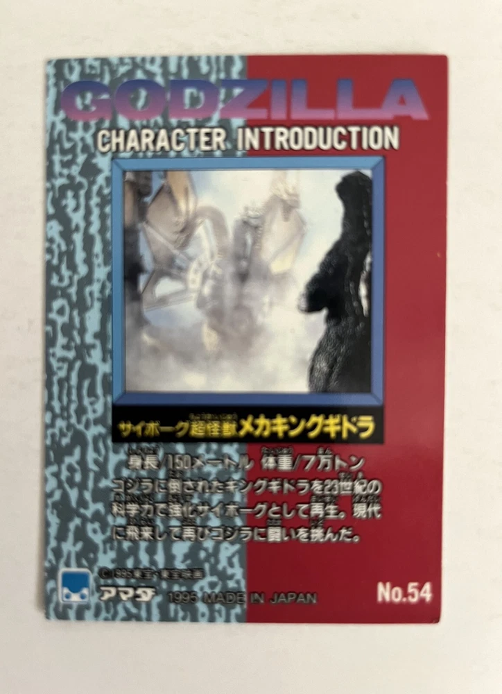 Godzilla King of Monsters, Japanese non-sport trading card (Amada, 1995). #54, Mecha-King Ghidorah. Ex/NM condition. From a smoke-free home. I combine shipping for multiple purchases. Please add the items you wish to purchase to your cart, and request a combined shipping total. Please do not pay until you receive a new invoice. Combined shipping cost will depend on the total weight of the package and the destination.