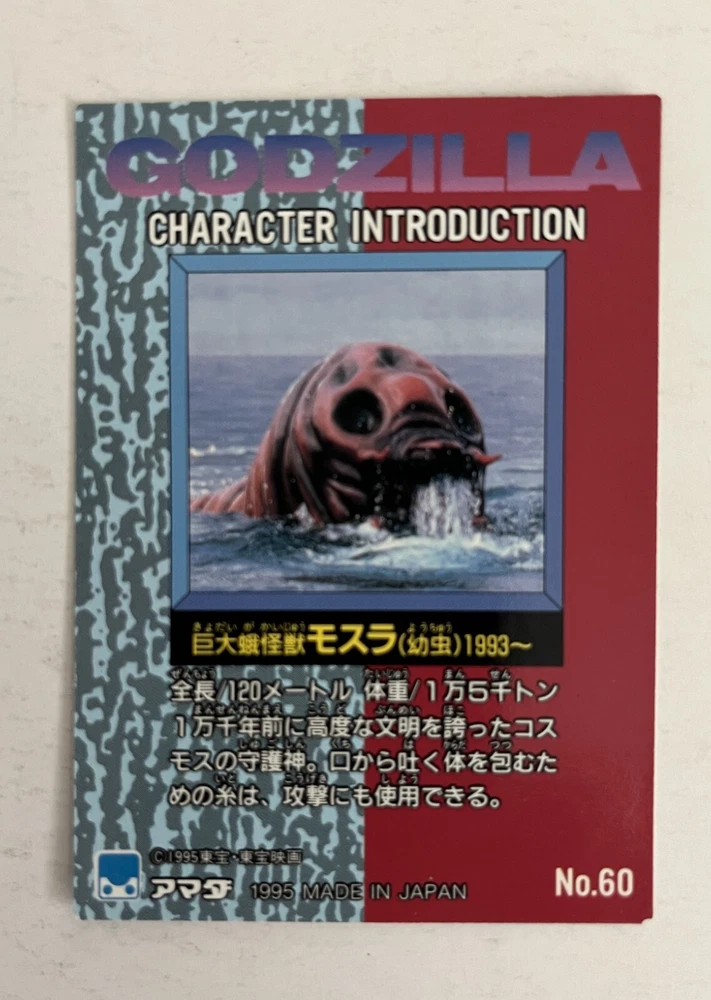 Godzilla King of Monsters, Japanese non-sport trading card (Amada, 1995). #60, Mothra. Ex/NM condition. From a smoke-free home. I combine shipping for multiple purchases. Please add the items you wish to purchase to your cart, and request a combined shipping total. Please do not pay until you receive a new invoice. Combined shipping cost will depend on the total weight of the package and the destination.