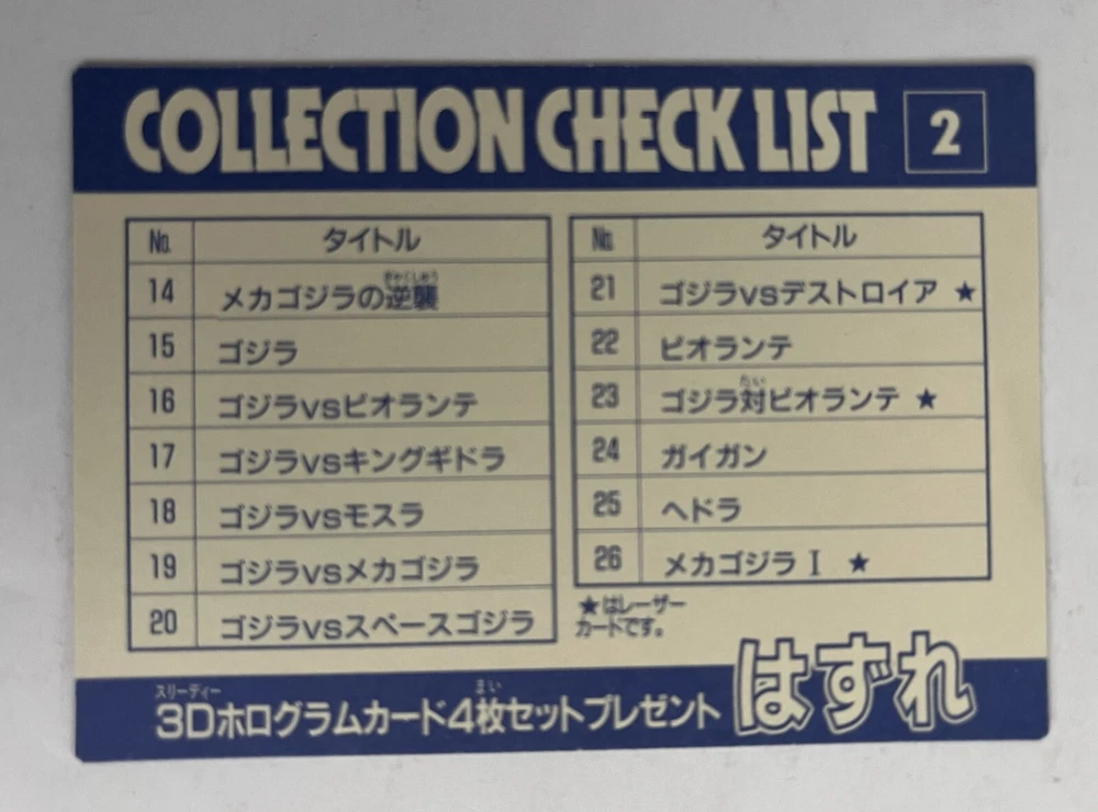 Godzilla King of Monsters, Japanese non-sport trading card (Amada, 1995). Collection Check List 2. Ex/NM condition. From a smoke-free home. I combine shipping for multiple purchases. Please add the items you wish to purchase to your cart, and request a combined shipping total. Please do not pay until you receive a new invoice. Combined shipping cost will depend on the total weight of the package and the destination.