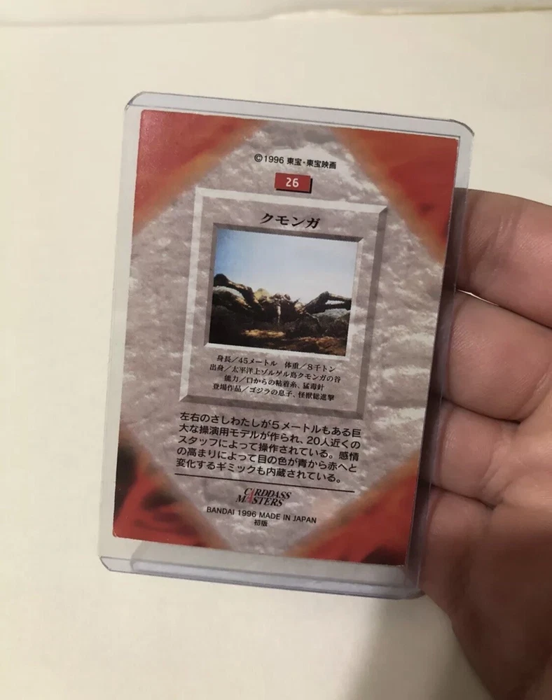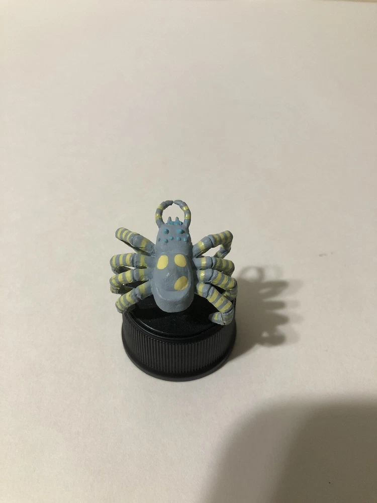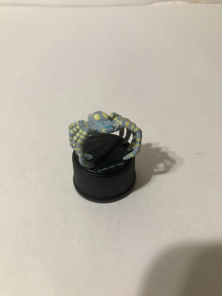 A bottle cap of the kaiju Kumonga as he appears in “Son of Godzilla” and “Destroy All Monsters.” He stands two inches tall and was only displayed. One leg is detached from the bottle cap stand, but it doesn’t impact look or stability. Comes with trading card in sleeve. Comes from a smoke free home.