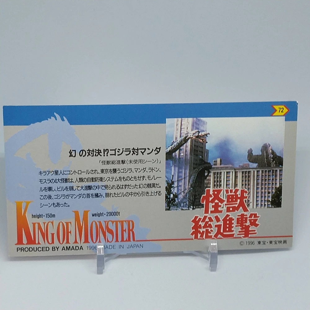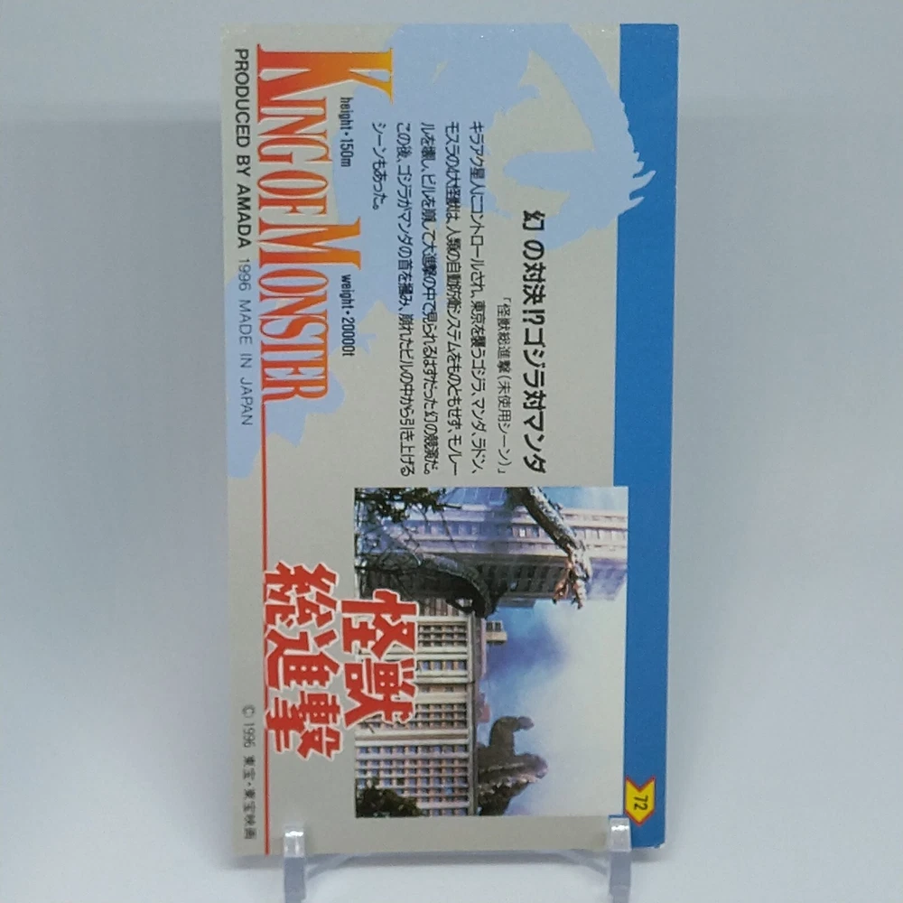Godzilla Manda King of Monster Amada Wide Collection Trading Card No.72 1996 Description Please see the picture for the details of damages and dirt or ask us before your purchase. 100% Authentic or Money Back Guaranteed. (Do not worry you are protected by eBay and eBay Managed Payments) See the pictures for more details. If you have any question about the condition, accessories, or anything about the product, please feel free to message us. We are glad to answer all your concerns. Payment Same as ebay payment method. Shipping Economy shipping: Delivery time will be about 11 - 23 days. Standard shipping: Delivery time will be about 5 - 10 days. Expedited shipping: Delivery time will be about 1 - 4 days. Terms of Sale Money back guarantee within 30 days if returned by customer. We would not be able to accept your bid if you; 1) Don't have a PayPal account. 2) Have unpaid items reported. 3) Have a primary shipping address in countries you don't ship to. 4) Have reportedly violated eBay policies. 5) Have a Feedback score lower than the number you specify. International Buyers - Please Note: Import duties, taxes and charges are not included in the item price or shipping charges. These charges are the buyer's responsibility. Please check with your country's customs office to determine what these additional costs will be prior to bidding/buying. These charges are normally collected by the delivering freight (shipping) company or when you pick the item up - do not confuse them for additional shipping charges.