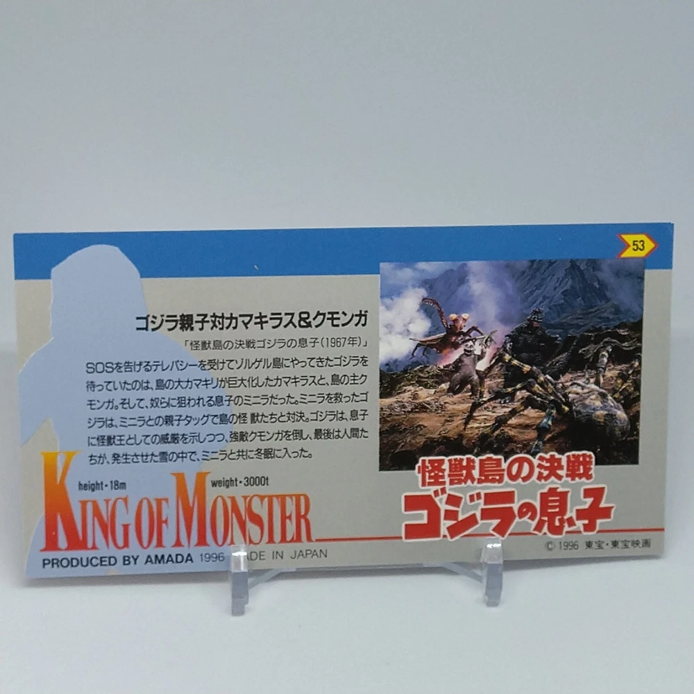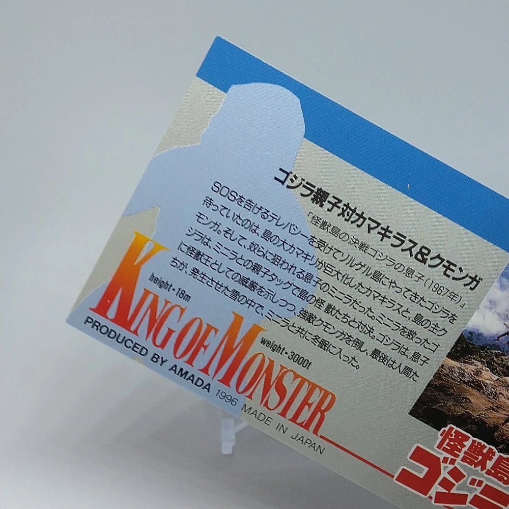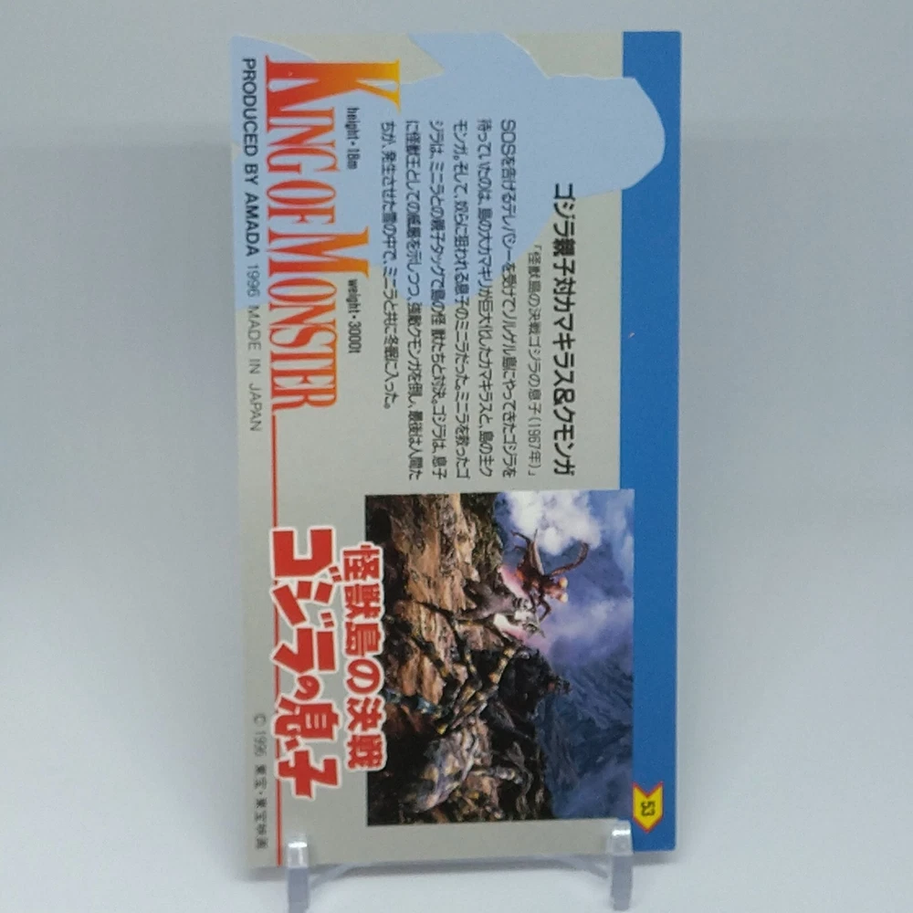 Godzilla Minya King of Monster Amada Wide Collection Trading Card No.53 1996 Description Please see the picture for the details of damages and dirt or ask us before your purchase. 100% Authentic or Money Back Guaranteed. (Do not worry you are protected by eBay and eBay Managed Payments) See the pictures for more details. If you have any question about the condition, accessories, or anything about the product, please feel free to message us. We are glad to answer all your concerns. Payment Same as ebay payment method. Shipping Economy shipping: Delivery time will be about 11 - 23 days. Standard shipping: Delivery time will be about 5 - 10 days. Expedited shipping: Delivery time will be about 1 - 4 days. Terms of Sale Money back guarantee within 30 days if returned by customer. We would not be able to accept your bid if you; 1) Don't have a PayPal account. 2) Have unpaid items reported. 3) Have a primary shipping address in countries you don't ship to. 4) Have reportedly violated eBay policies. 5) Have a Feedback score lower than the number you specify. International Buyers - Please Note: Import duties, taxes and charges are not included in the item price or shipping charges. These charges are the buyer's responsibility. Please check with your country's customs office to determine what these additional costs will be prior to bidding/buying. These charges are normally collected by the delivering freight (shipping) company or when you pick the item up - do not confuse them for additional shipping charges.