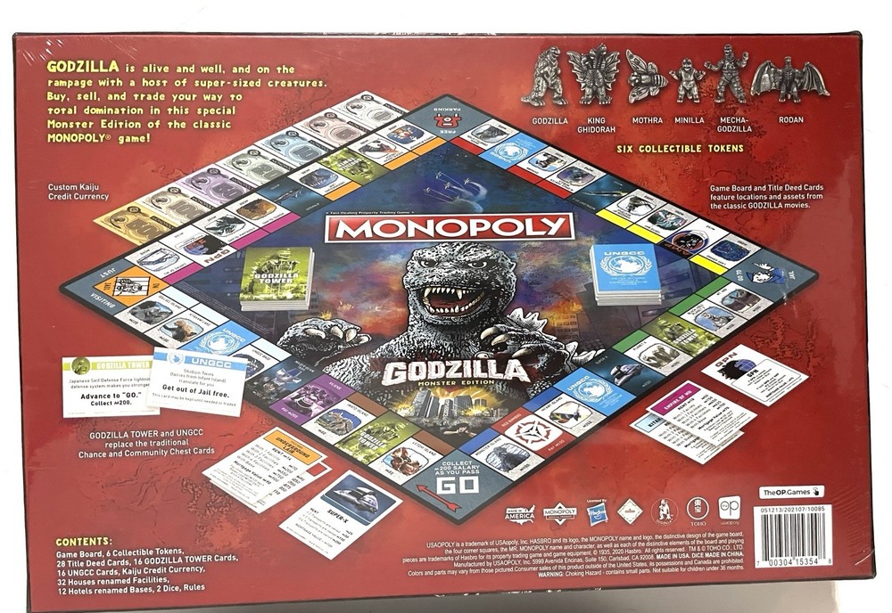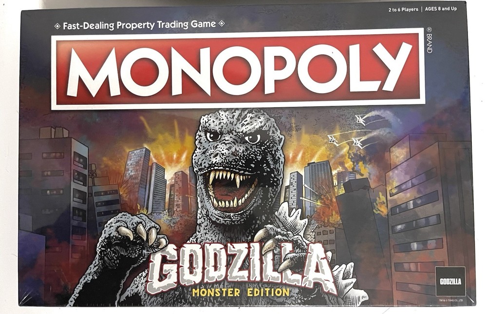 Experience the thrill of owning and operating your very own monster-themed real estate empire with the Godzilla Monopoly Board Game. This game is perfect for fans of strategy and Godzilla alike. With the ability to play with 6 or more players, it's great for family game night or playing with friends. Immerse yourself in the world of Godzilla as you buy, sell, and trade properties with the iconic monster at the center of it all. This brand new, contemporary manufactured board game is a must-have for collectors and gamers alike. Don't miss your chance to own the Godzilla Monopoly Board Game.