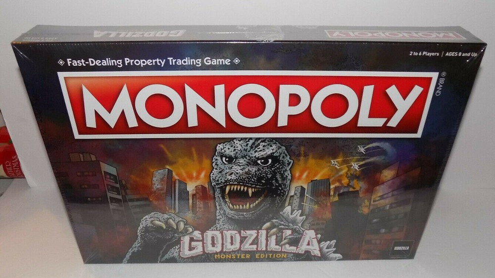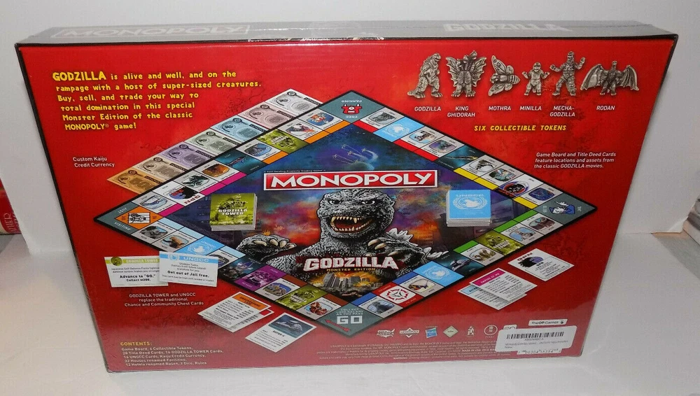 This item is new in original wrapper. Monopoly board game with monster pieces and themed cards Iconic Kaiju Monsters