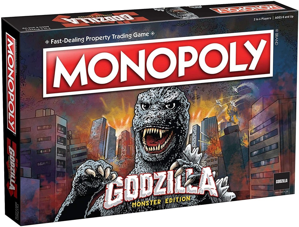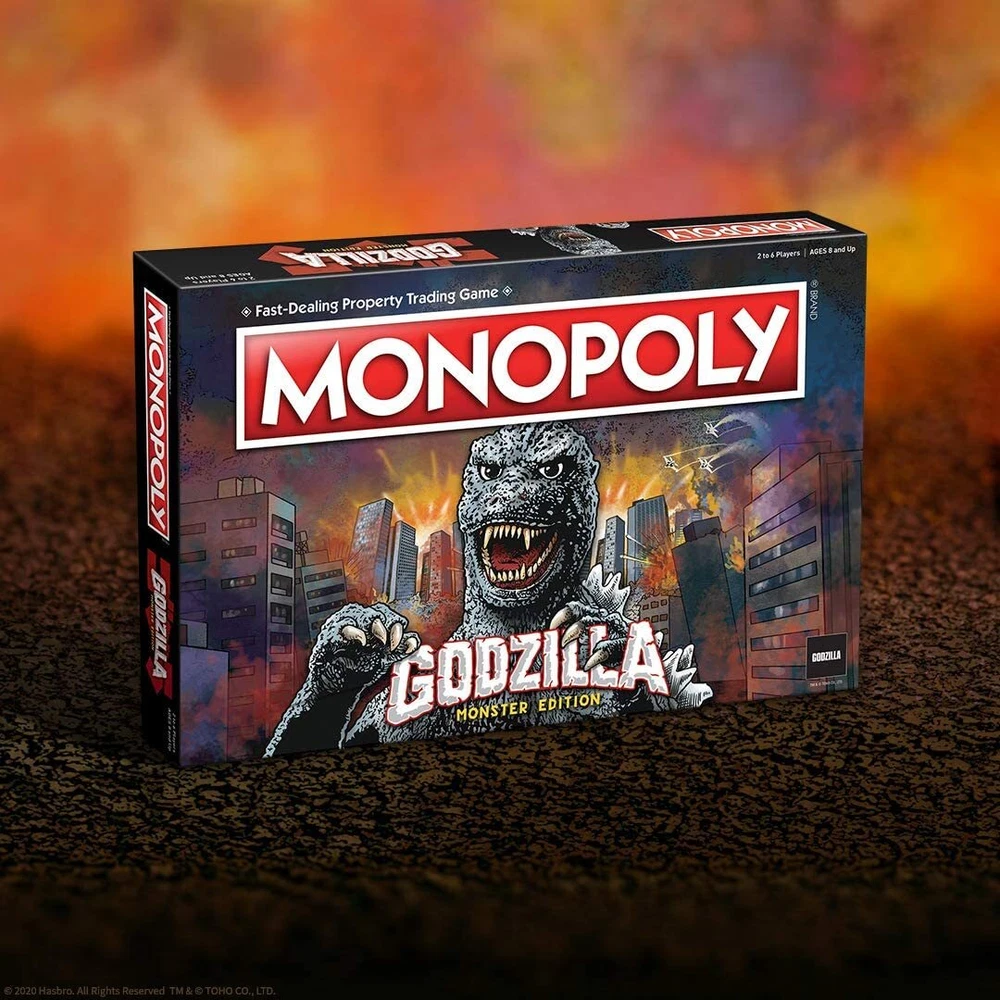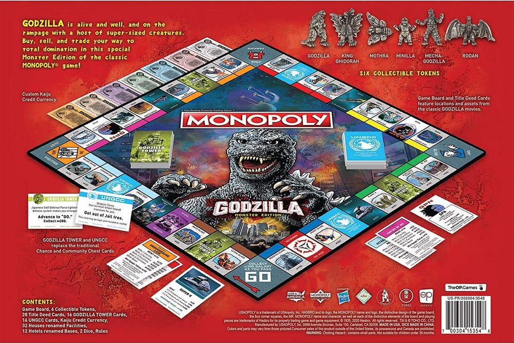 Put your Godzilla fandom to use in MONOPOLY®: Godzilla! Buy, sell and trade your favorite locations from the different Godzilla movies and eras. Choose your favorite token to travel around the board and relive your favorite moments from this worldwide pop-culture icon! Contents: 1 Game Board 6 Collectible Tokens: Godzilla, Mothra, King Ghidorah, Minilla, Mechagodzilla, Rodan 28 Title Deed Cards 32 Houses renamed FACILITIES 12 Hotels renamed BASES 16 UNGCC Cards 16 GODZILLA Tower Cards 1 Pack of Kaiju Credit Currency 2 Dice Rules