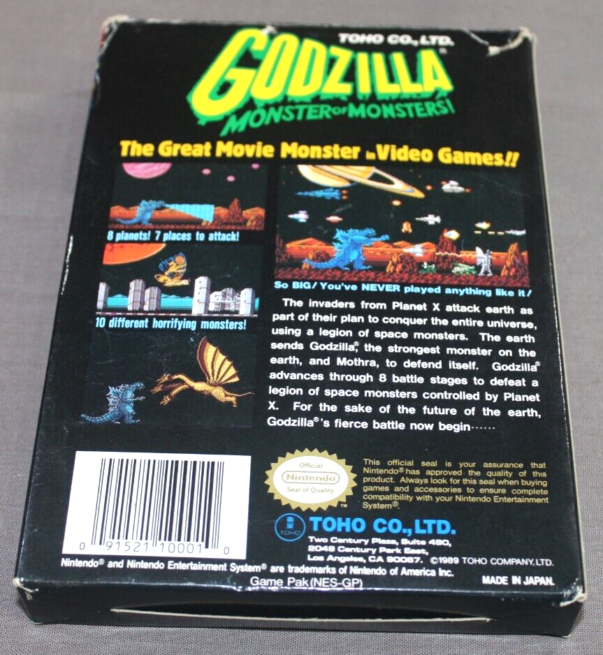 Godzilla: Monster Of Monsters ~ Original Nintendo (NES, 1989) Game ~ CIB Please Read This is a Godzilla: Monster Of Monsters ~ Original Nintendo (NES, 1989) Game ~ CIB. This game set is pre-owned and in very good condition. Everything comes in the original box ~ box does have some shelf wear consistent with age and storage ~ mostly on the corners ~ as well as it's missing one of the small flaps on the opening edge. Game cartridge is like new ~ no signs of use or wear of any kind. Tested and works perfectly. Comes with the manual ~ in great shape ~ has a minor wrinkle on the front cover (along the spine edge) from being improperly put into the box. Missing any advertisements inserts that may have come inside. Has the black, plastic cartridge sleeve. Please see all included pictures for visual condition and item description. Items pictured are the exact items you will receive. This sale only includes item(s) pictured. Please read our terms and conditions. Feel free to contact us with any questions or concerns that you may have. We are a second hand store and unless specifically stated all items are used. We do the best we can to be thorough when describing an item. Questions are welcome but please understand that we are not the original owners of any items for sale. Our knowledge of all items is based off past experience in using/handling/selling a product and select or niche items are often out of our expertise. If we do not know the answer to a question we will do our best to answer it, but technical questions may better be suited for your own research as we may not know what to look for. Leading customers astray on a product is the last thing we want and if you know more about an item than we do, your own research may find you a better answer. Shipping & Returns Our eBay store is manned Monday thru Friday 10am - 5pm EST. Please keep that in mind when contacting us. The buyer has 30 days to return an item if they are not satisfied for a full refund. Shipping is available within the continental United States. We offer combined shipping for your multiple purchases. We ship our items using USPS or Fed Ex. If a package is returned to us because of an incorrect address or if someone was not there to accept the package, the buyer is responsible for any additional shipping charges. Please contact us for more information prior to purchase. We ship items within 1 business day after receiving payment. Thank you and happy shopping!