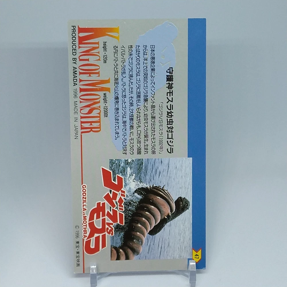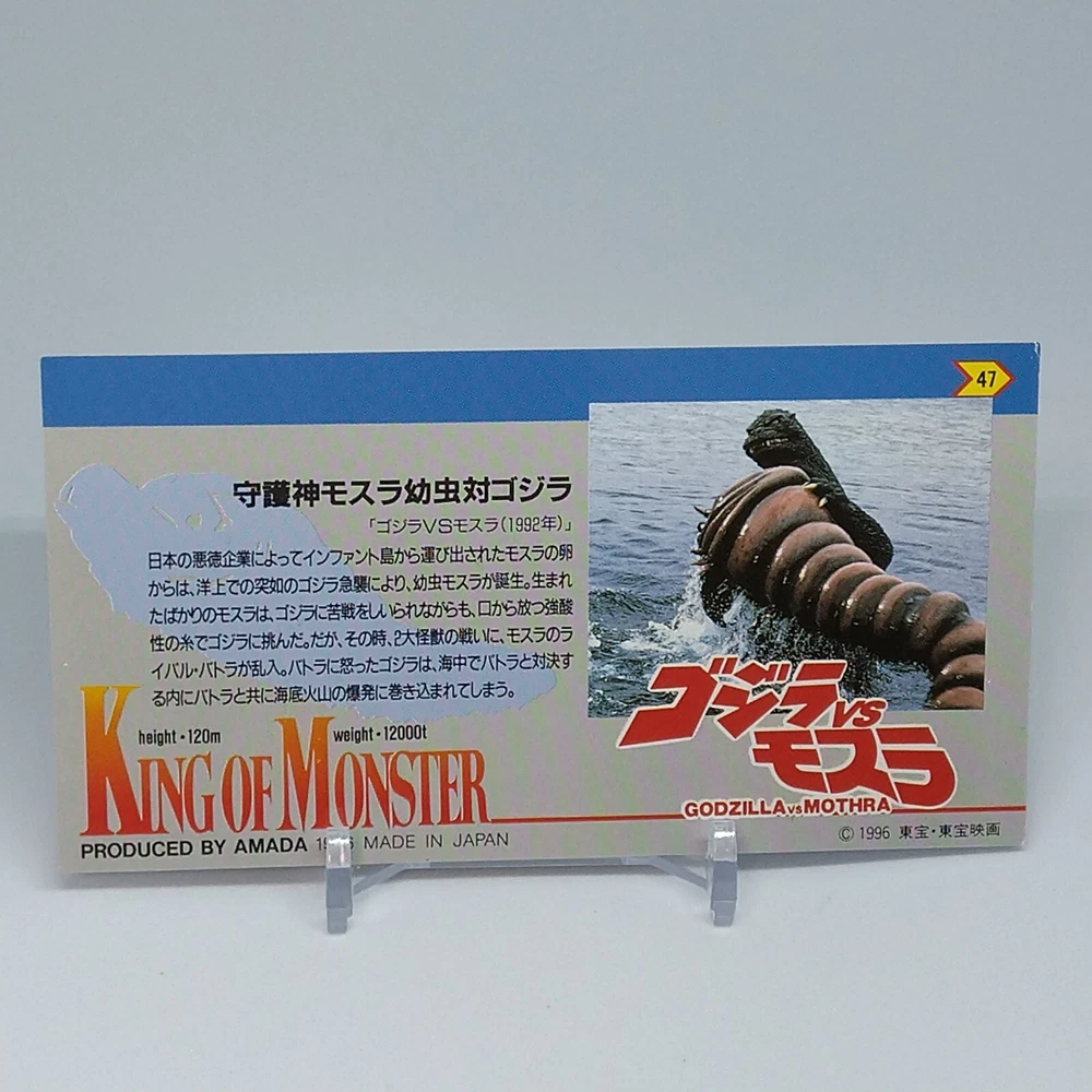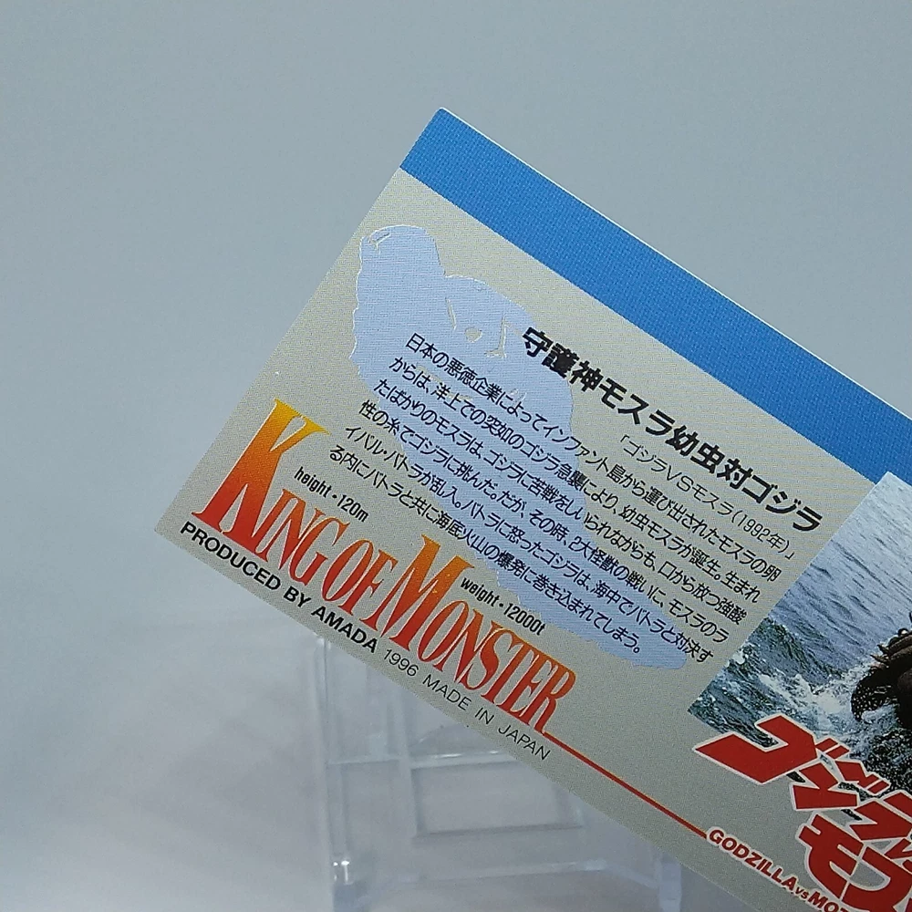 Godzilla Mothra King of Monster Amada Wide Collection Trading Card No.47 1996 Description Please see the picture for the details of damages and dirt or ask us before your purchase. 100% Authentic or Money Back Guaranteed. (Do not worry you are protected by eBay and eBay Managed Payments) See the pictures for more details. If you have any question about the condition, accessories, or anything about the product, please feel free to message us. We are glad to answer all your concerns. Payment Same as ebay payment method. Shipping Economy shipping: Delivery time will be about 11 - 23 days. Standard shipping: Delivery time will be about 5 - 10 days. Expedited shipping: Delivery time will be about 1 - 4 days. Terms of Sale Money back guarantee within 30 days if returned by customer. We would not be able to accept your bid if you; 1) Don't have a PayPal account. 2) Have unpaid items reported. 3) Have a primary shipping address in countries you don't ship to. 4) Have reportedly violated eBay policies. 5) Have a Feedback score lower than the number you specify. International Buyers - Please Note: Import duties, taxes and charges are not included in the item price or shipping charges. These charges are the buyer's responsibility. Please check with your country's customs office to determine what these additional costs will be prior to bidding/buying. These charges are normally collected by the delivering freight (shipping) company or when you pick the item up - do not confuse them for additional shipping charges.