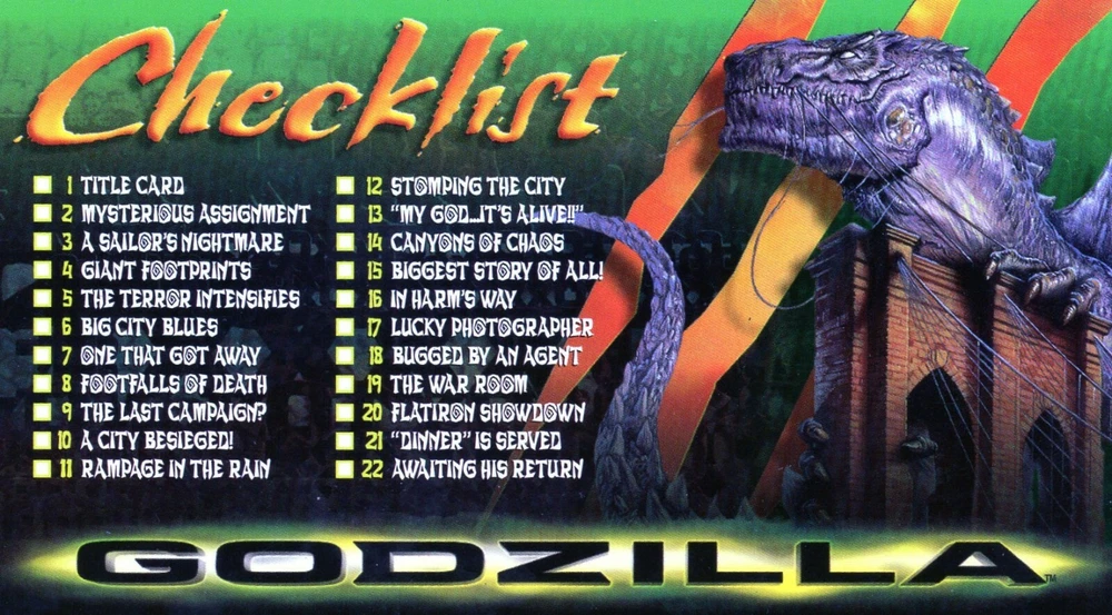Godzilla Movie 1998 Widescreen Individual Trading Cards These Cards are Cinemascope style The size of these cards are 114mm X 64mm These Cards Are Sold Individually All Cards are in V Good Condition Money back if not completely happy Mail same day if before 12 noon or next working day ( Monday To Friday )