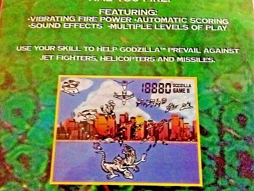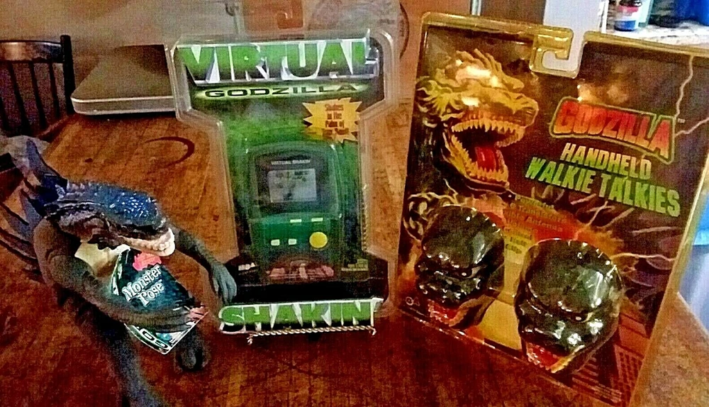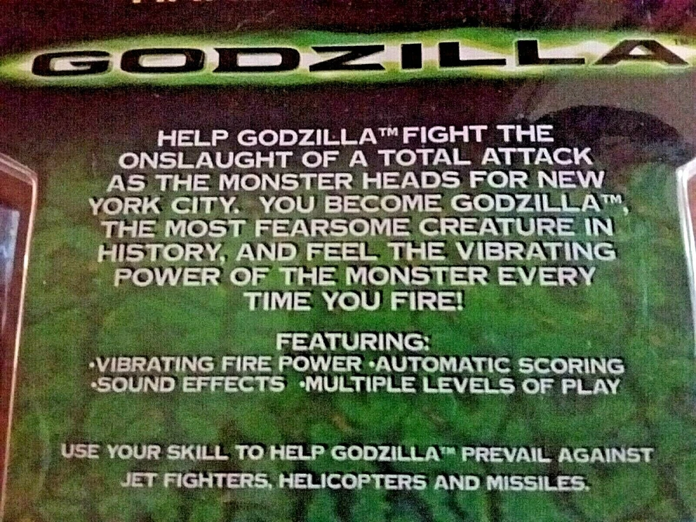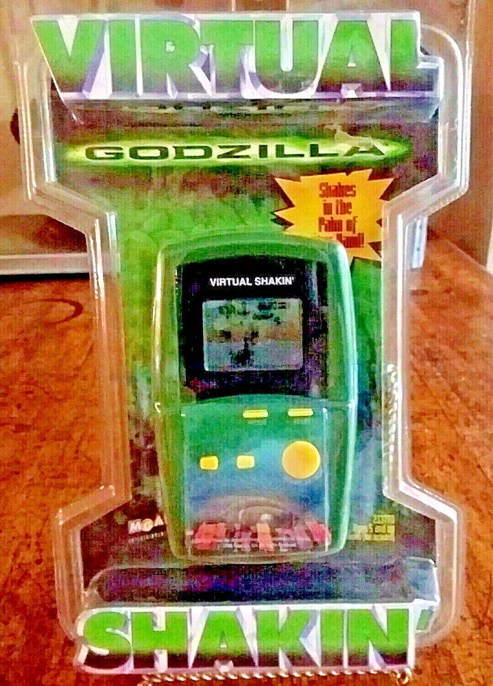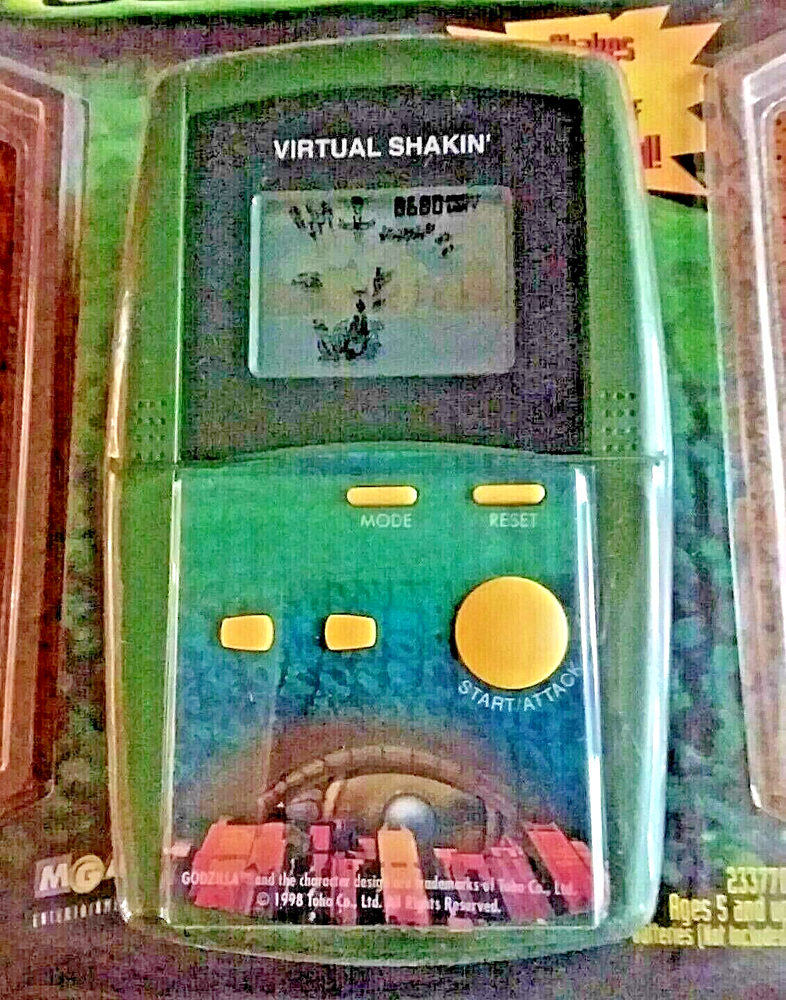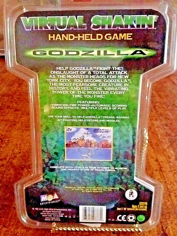 From the movie, Godzilla Virtual Shakin' hand-held electronic game with vibrating fire power, automatic scoring, sound effects & multiple levels of play, new in package, 1998. Please see other Godzilla items we have listed, and message with any questions.