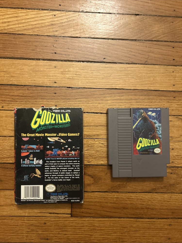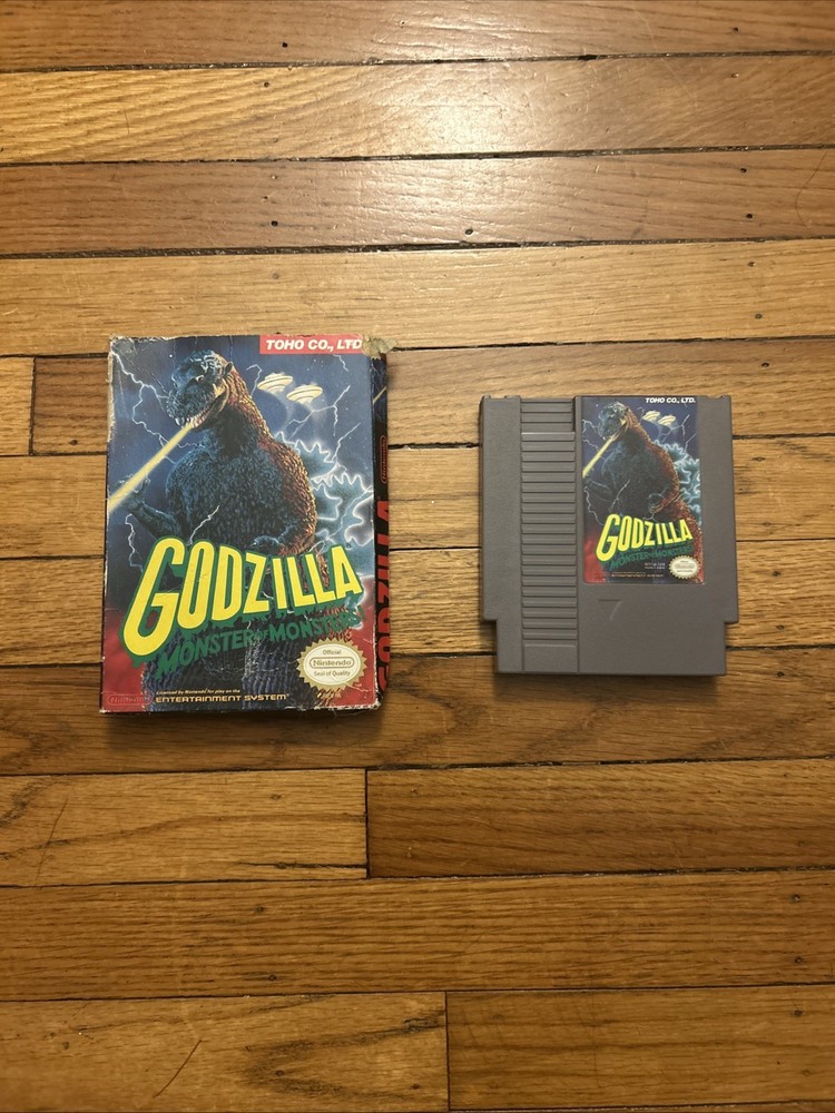 The product is a working Godzilla video game for the Nintendo Entertainment System (NES), with the top flap of the box missing....
