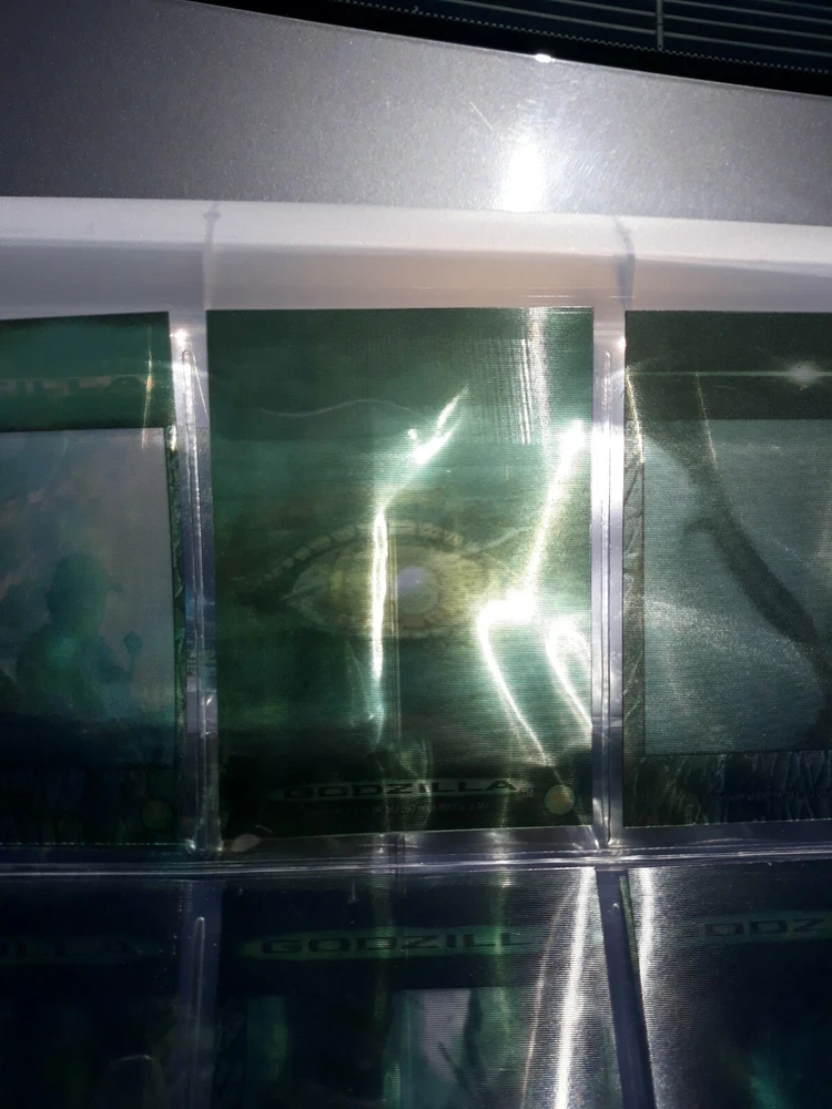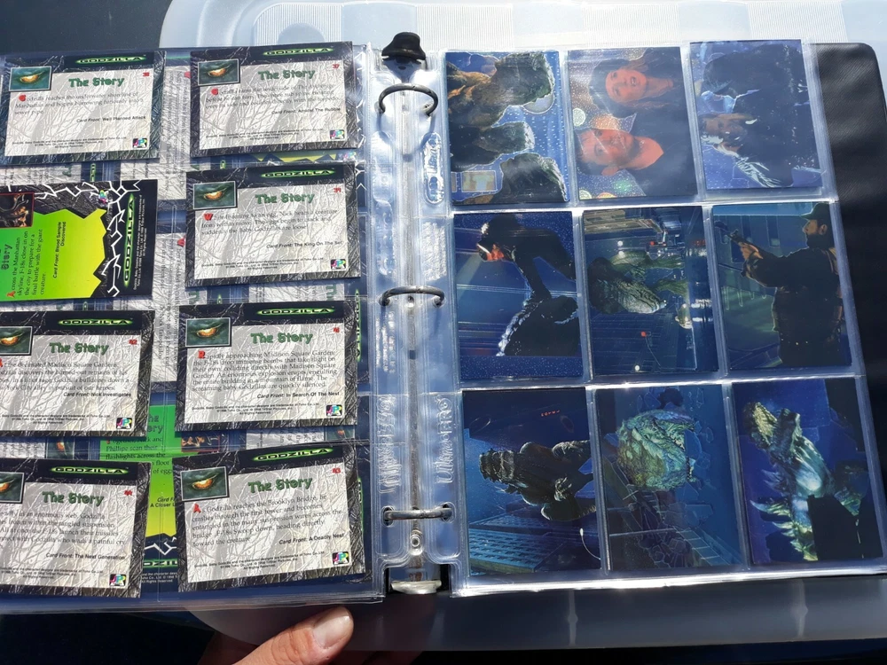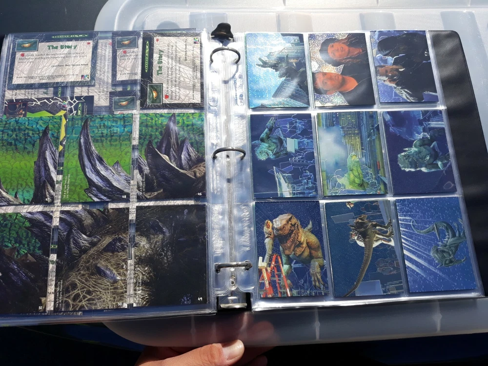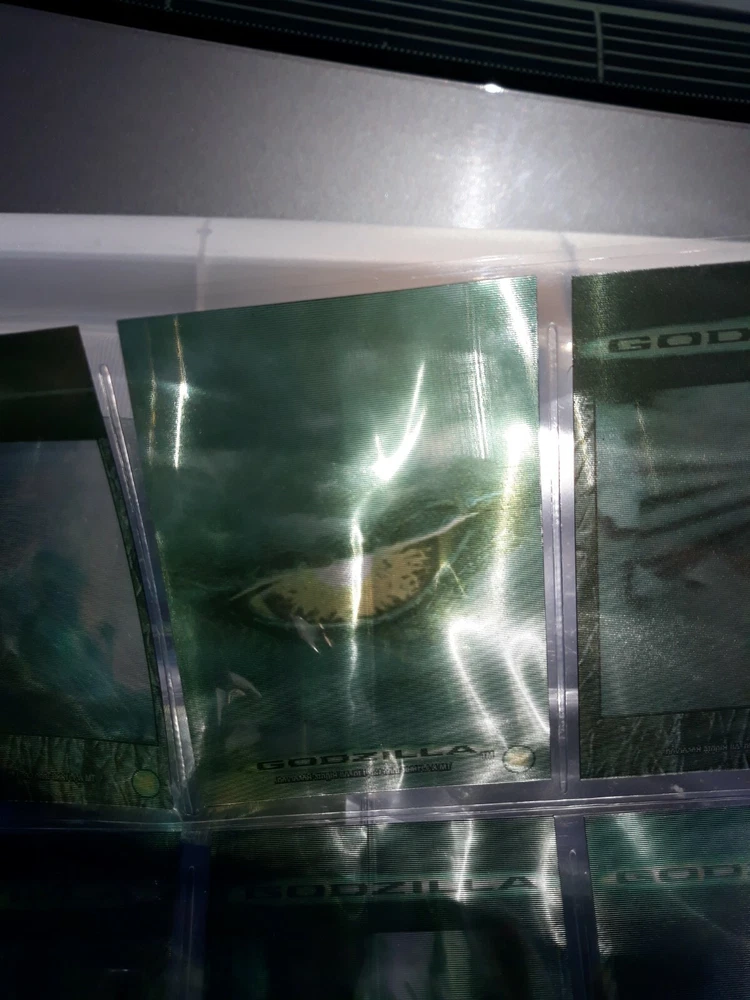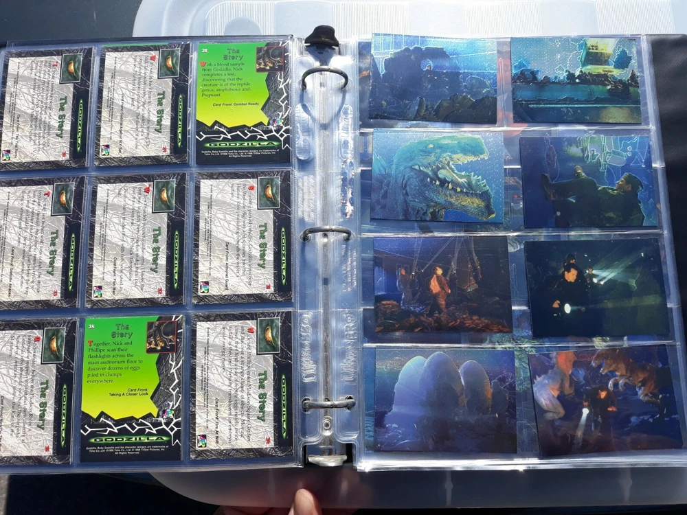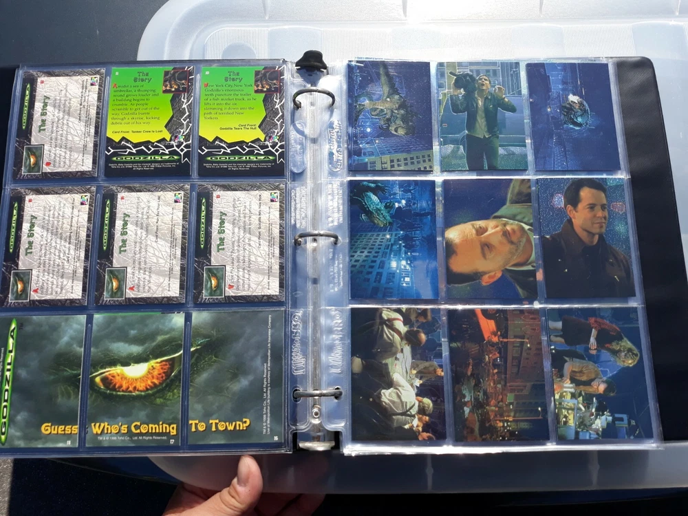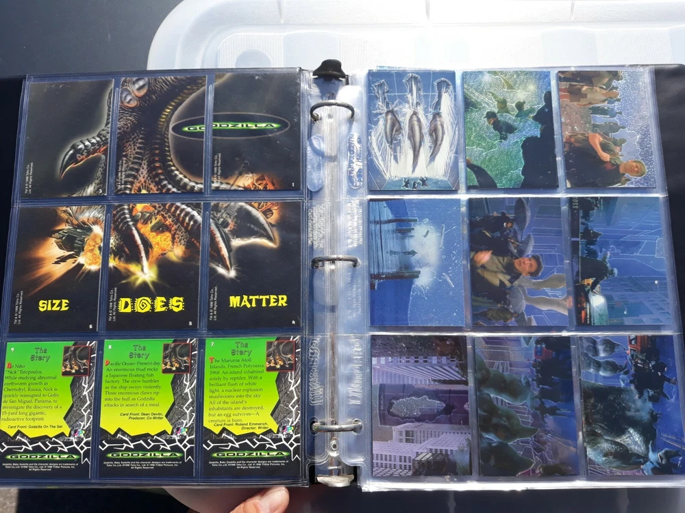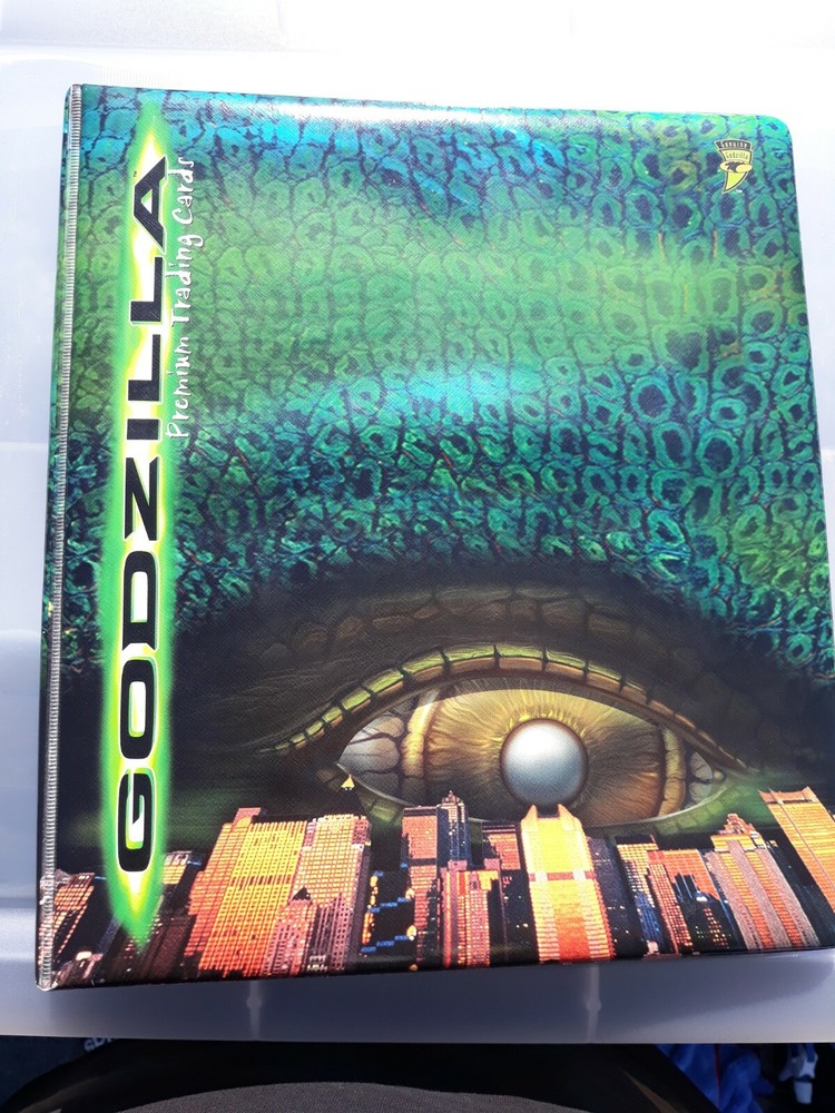 Godzilla Premeium Trading Cards Complete Set of Metal and Motion Cards w/Binder. Shipped with tracking in a bubble mailer. Has complete 60 card checklist of the Godzilla 'Metal Tex' Foil Cards (Beginning of binder) as well as the complete checklist of the Godzilla 'Motion' Cards (End section of binder). These trading cards tell the movie from beginning to end while having some cool shots of godzilla from the film. The motion cards are even cooler. They are all in near mint condition. Lightly Played if anything. The cards come with an extra page to protect the front and back of the other pages. Its all comes in a really good condition Godzilla binder as well. If u want more pictures of have any questions feel free to message whenever. Thank you for your interest!