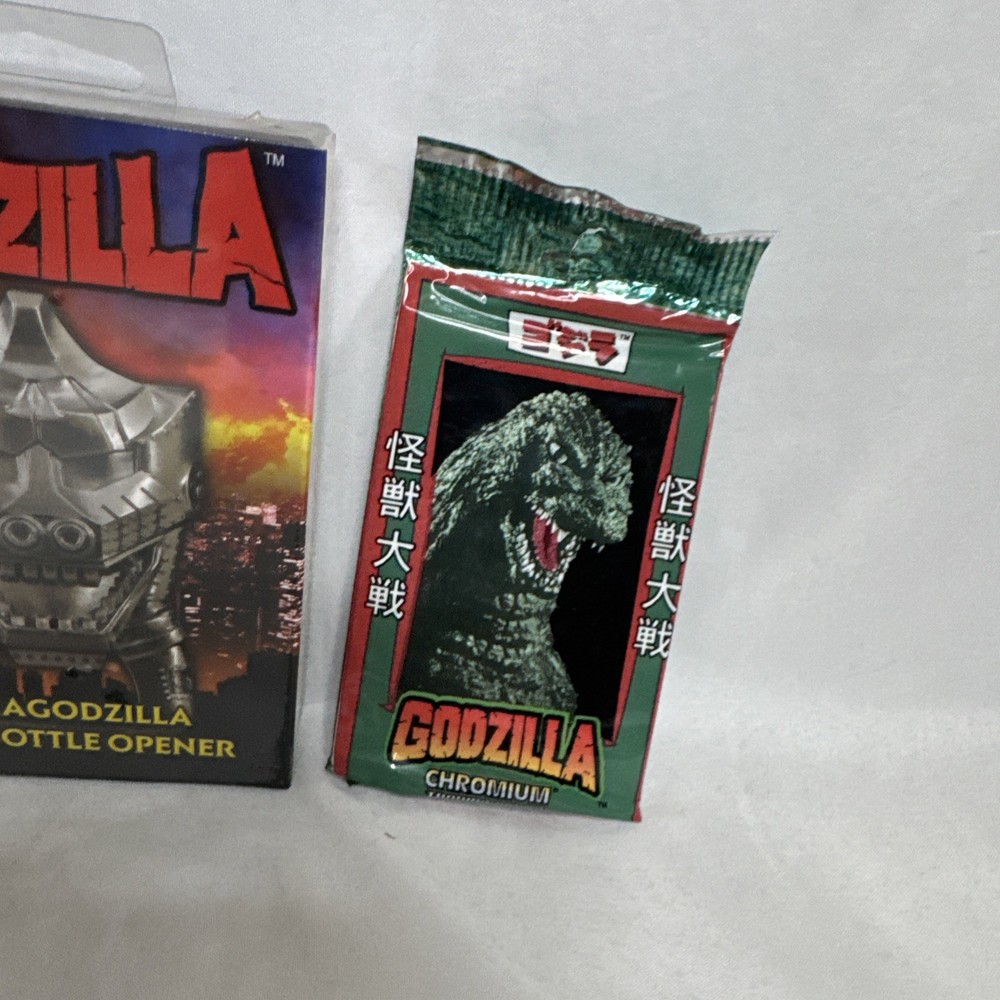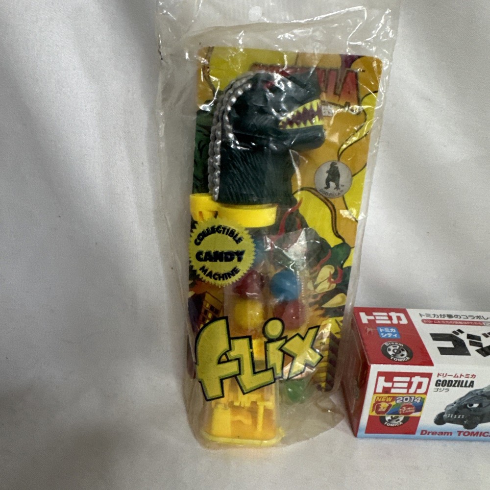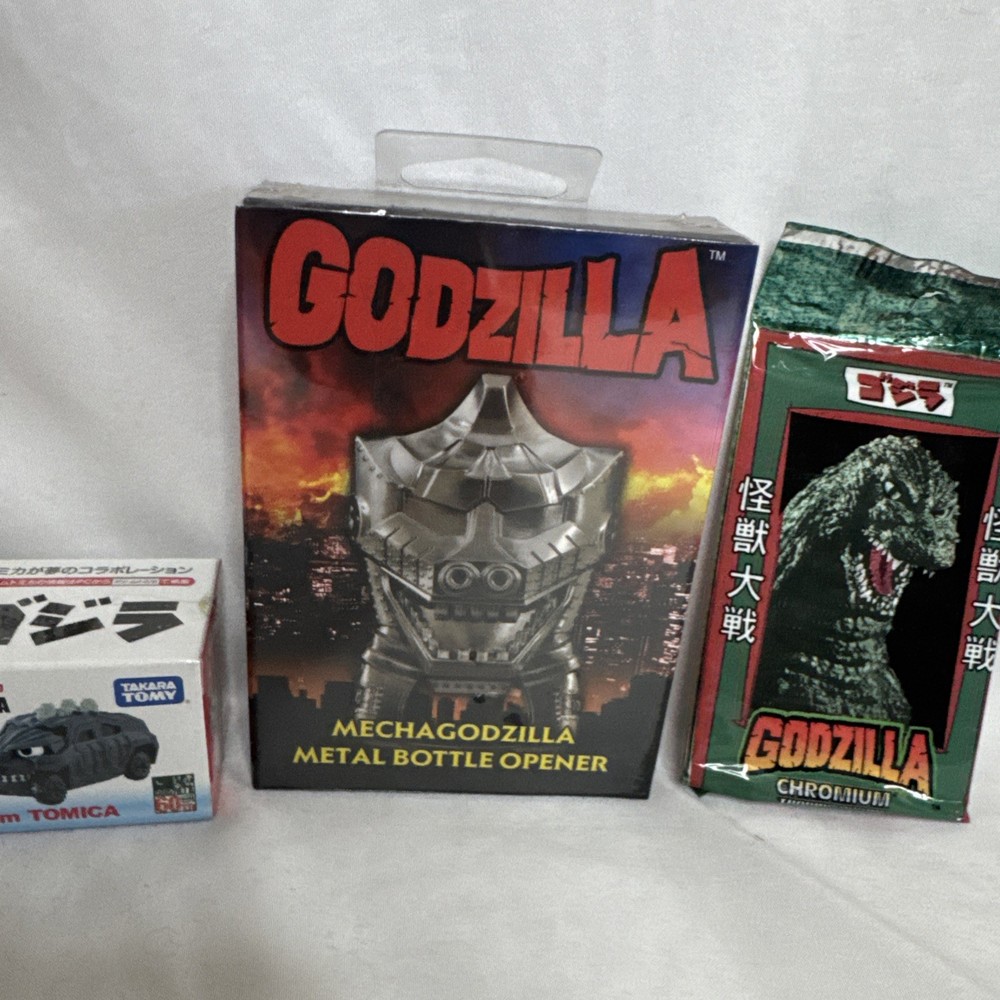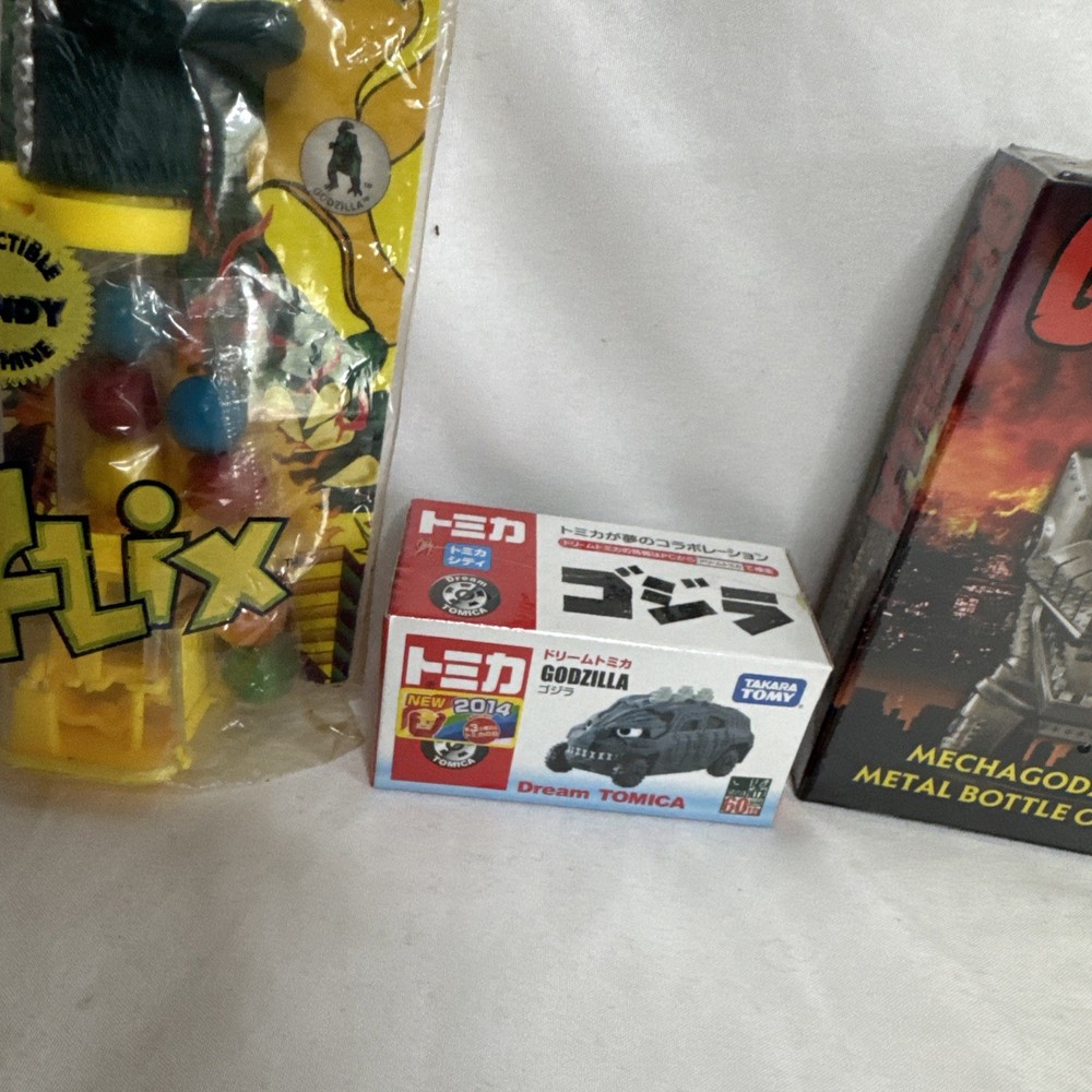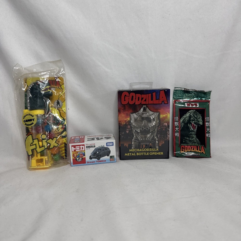 The product is a random lot of 4 Godzilla toys from the year 2014, manufactured by Diamond Select in China. These toys are part of the Godzilla theme, targeted towards ages 12-16 years. Perfect for fans of the iconic monster, this collection offers a variety of toys and collectibles to enjoy and add to their collection. 1. Collectible Candy Machine 2. Dream Tomica Godzilla Car 3. MechaGodzilla Bottle Opener 4. Godzilla Chromium Trading Cards