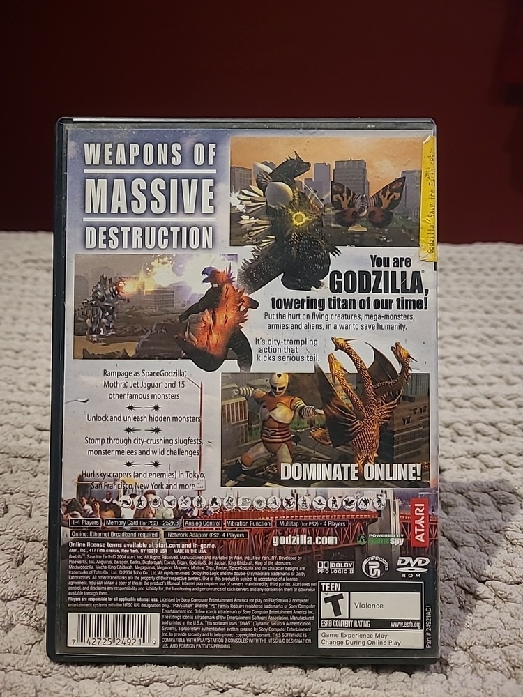 The product is a Sony PlayStation 2 game titled "Godzilla: Save the Earth," published by Atari Inc. It falls under the action and adventure genre, suitable for players aged T-Teen. The game likely follows the iconic monster Godzilla in a mission to save the earth from various threats, offering an exciting and immersive gaming experience on the popular PlayStation 2 platform.