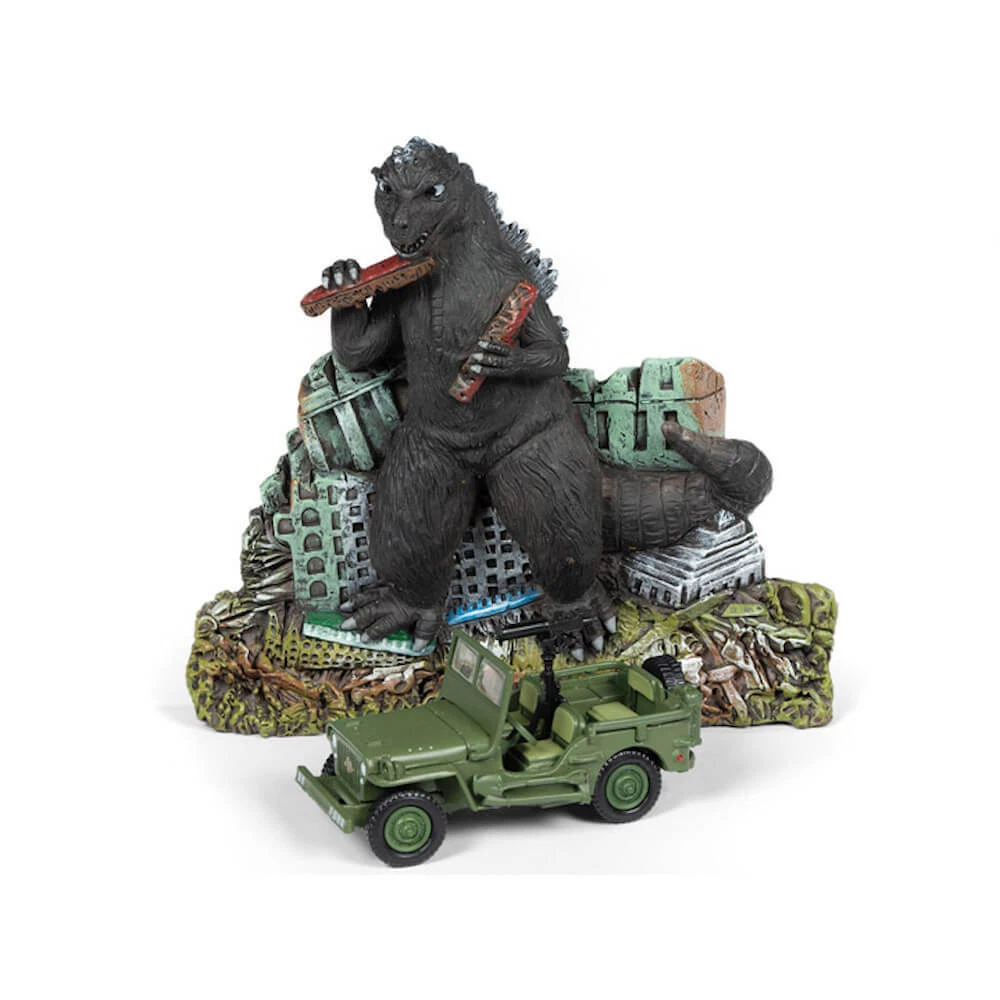 The Johnny Lightning Willy's MB Jeep Japan Police Reserve Corps Ground Assault features the King of Monsters on a destroyed city base chomping on some trains. The included Willy's MB Jeep features a die-cast body and rubber tires. This brilliant diorama is the perfect gift for die-hard Godzilla and/or Willy's MB Jeep buffs! The diorama is a 1/64 scale die-cast model replica. It comes in green and features real rubber tires, metal body and chassis, detailed exterior and comes in a blister pack. It's an outstanding addition for any diorama collection. 1/64 scale collectible vehicle model Highly Detailed Polyresin Relief Jeep has Die-Cast Metal body and Chassis Willy's MB Jeep Japan Police Reserve Corps with Godzilla Facade Diorama is a 2.25" long model with some plastic parts Manufactured by Round 2 Real rubber tires, metal body and chassis, detailed exterior, comes in a blister pack At Retroactives.com all orders qualify for free 2 to 3 day shipping!