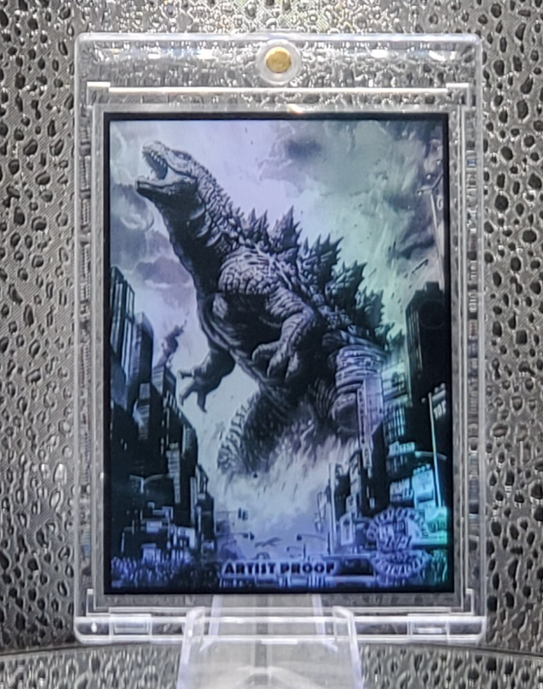 This Godzilla holo card is a must-have for collectors! The vibrant holographic finish makes the sketch pop, and Robert Camacho’s signature adds serious value. The unique 1/1 artist proof status makes it extra special—perfect for fans of his bold, comic-style art. The quality and detail are incredible for its size. A true standout piece!