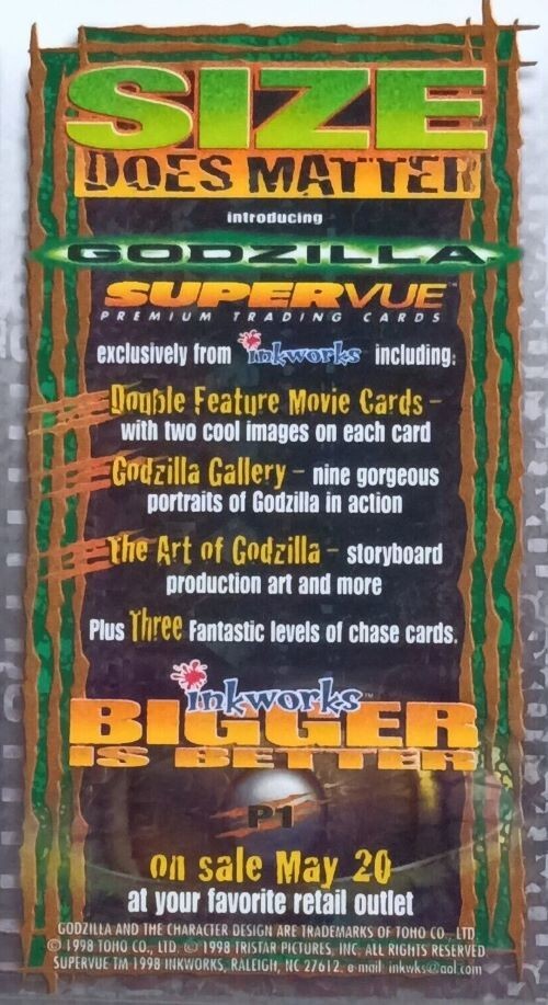 Godzilla Supervue 1998 Inkworks Promo Card #P1 Size Does Matter FAST SHIPPING GUARANTEED WORLDWIDE SHIPPING AVAILABLE Manufacturer: Inkworks Card Set: Godzilla Year: 1998 Card Number: P1 Card Type: Promo Card Card Name: Size Does Matter Condition: Mint/Near Mint Each single trading card is shipped in an archive quality sleeve in addition to a hard plastic top loader to preserve its condition. Order with confidence. This card has been meticulously stored in a private collection (smoke-free environment) since acquired in 1998. Now out of production for more than 25 years, these cards will continue to grow more difficult to find. Trekibles is passionate about high quality collectibles! If you share that passion, then we would appreciate the opportunity to earn your business. This product has been described to the best of our knowledge and in the greatest detail. We extensively research every item to provide you with accurate information and detailed history if applicable. Questions, suggestions, and/or expert comments are always welcome and appreciated. We have also taken detailed photographs of the actual product being sold. We have made every reasonable effort to disclose any known defects (if any). All statements regarding condition are based on more than thirty years of experience. In some cases, an expert appraisal has been contracted. Actual appraisal information (if applicable) is included in the item description. The legal (required) information: Trekibles gladly offers worldwide shipping via the United States Postal Service. Import duties, taxes and service fees are not included in the item price or shipping charges. These charges are the buyer’s responsibility. These charges are typically collected by the delivering freight (shipping) company when you receive your item. Please do not confuse these fees for additional shipping charges. Please check with your country’s customs office to determine what additional costs will be charged prior to purchasing or bidding. Trekibles does not mark merchandise values below value or mark items as “gifts.” United States and international government regulations prohibit such behavior. Trekibles has been serving collectors for more than thirty years and will carefully pack each item for maximum protection, but we cannot be held responsible for packages damaged during transit. In the rare event that an item is damaged during shipping, you must keep all packaging materials and boxes for an insurance claim. If your item is damaged or lost in shipping, a claim must be filed with the shipping carrier to receive compensation. Shipping charges cannot be refunded. We reserve the right to cancel bids and purchases of any user with a negative feedback rating. We reserve the right to relist any item if payment has not been received within the allotted amount of time. We reserve the right to block any user from future purchases based on past purchase behavior. We strive to earn a 5-Star Rating with every purchase. If our service does not meet your 5-Star Standard, please contact us PRIOR to leaving neutral or negative feedback. Most issues can be resolved with good communication. Trekibles wants you to be completely satisfied with your purchase. Please visit our eBay Store for more great collectibles Thanks for looking! We hope to have the opportunity to earn your business Trekibles – Passionate about Quality and Service Since 1989