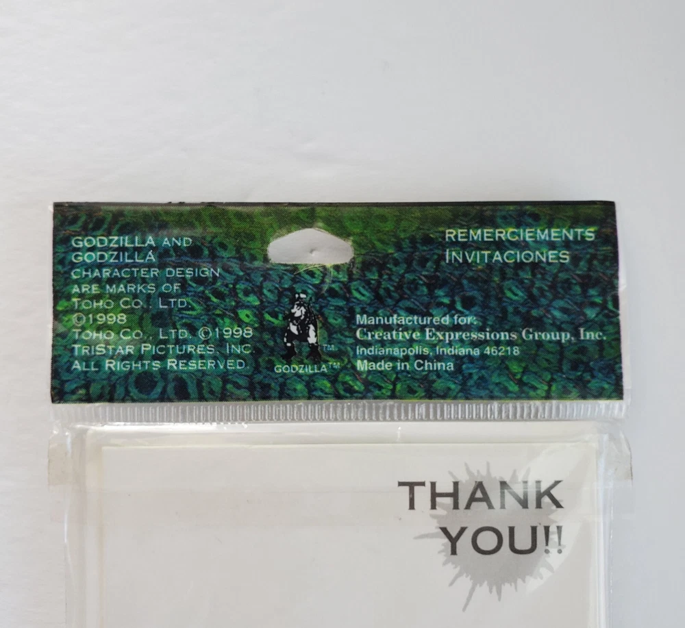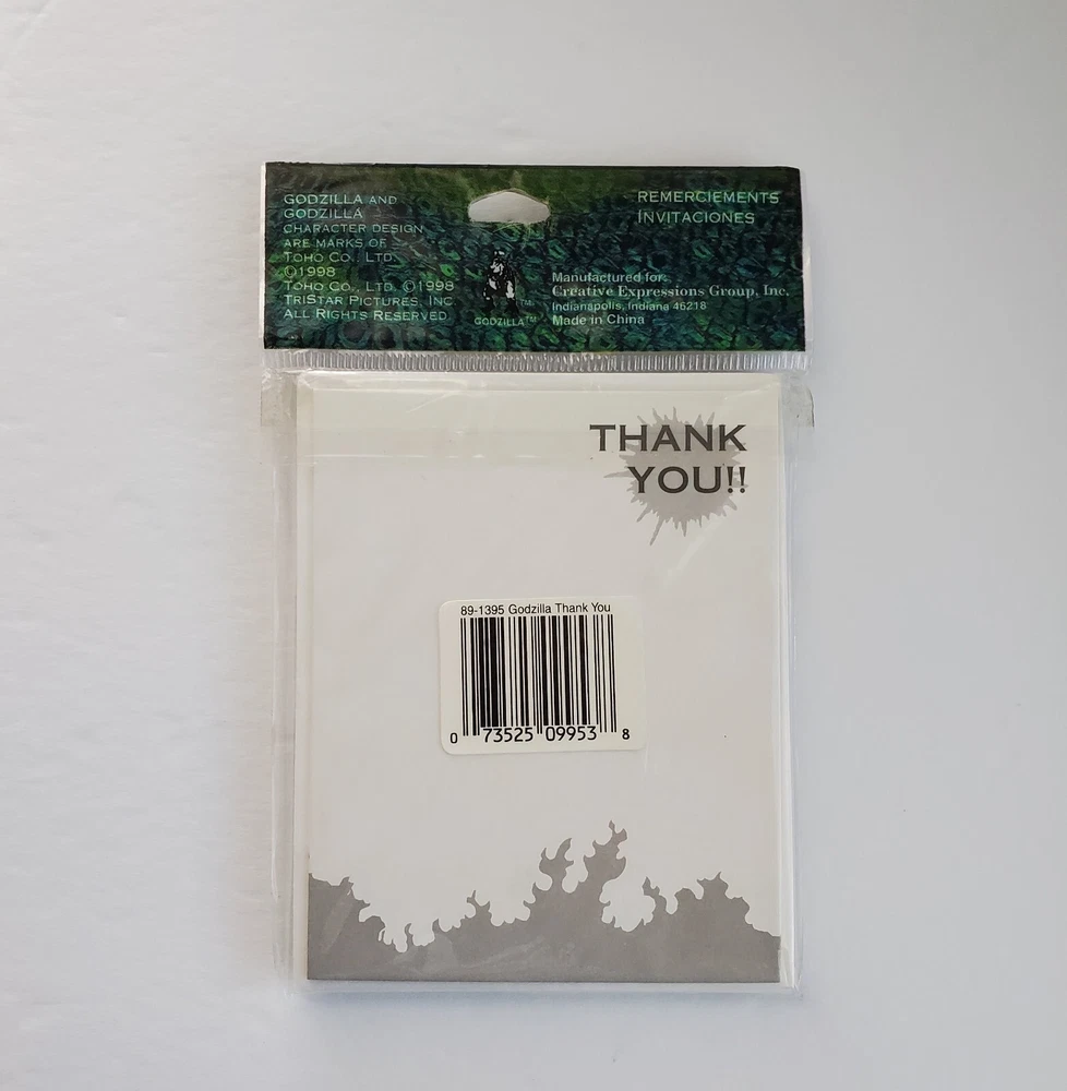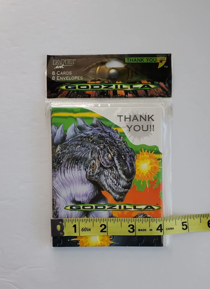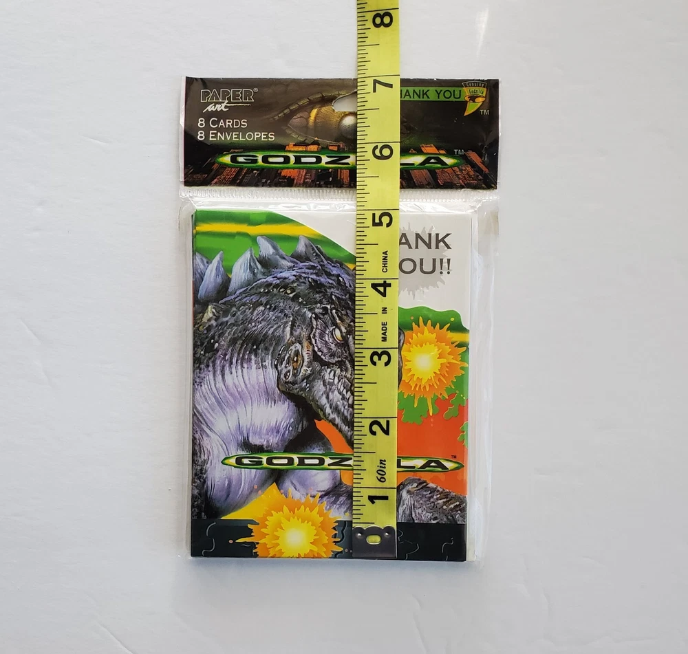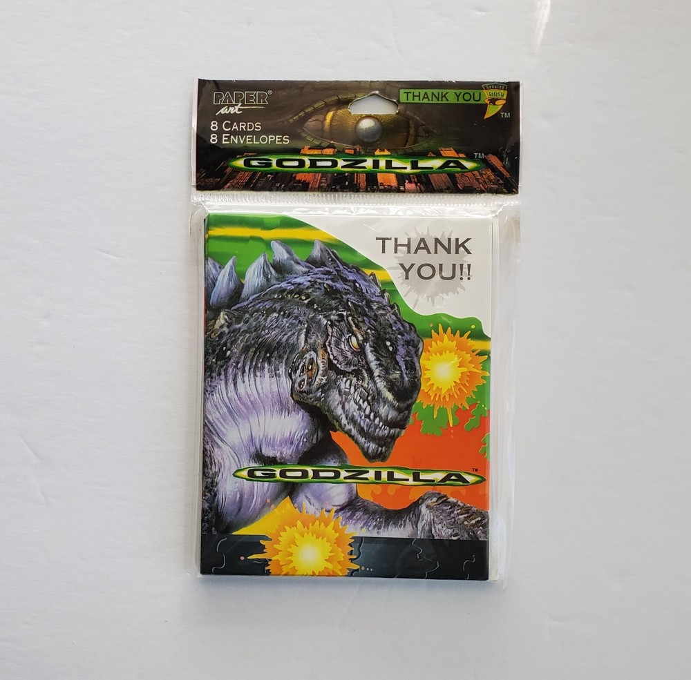 *This set of 8 vintage Godzilla thank you cards and envelopes are a rare find for any fan of the iconic monster. Created by Paper Art in 1998, these cards feature stunning artwork that captures the essence of the beloved character. The Plastic on the package has a little damage on it...See Picture #4. See Pictures #2 and #3 for measurements*