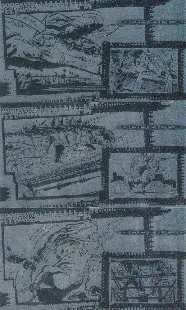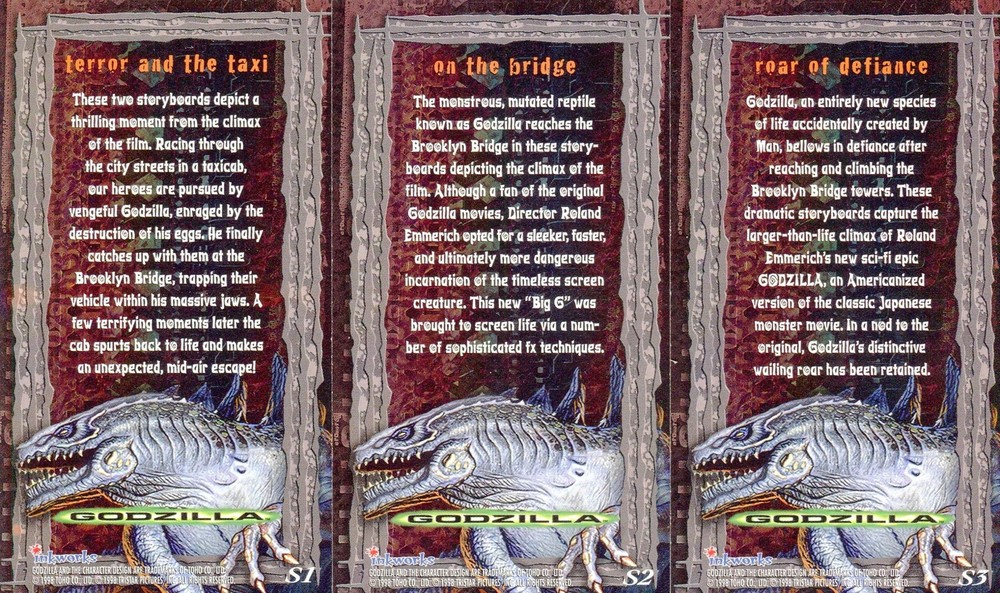Description: Godzilla The Movie Supervue Widevision Silverzilla Foil Chase Card Set Contents: 3 Silverzilla Foil Chase Cards (2 1/2" x 4 1/2" Widevision) S1 through S3. Manufacturer: Inkworks, 1998. Condition: Near Mint.