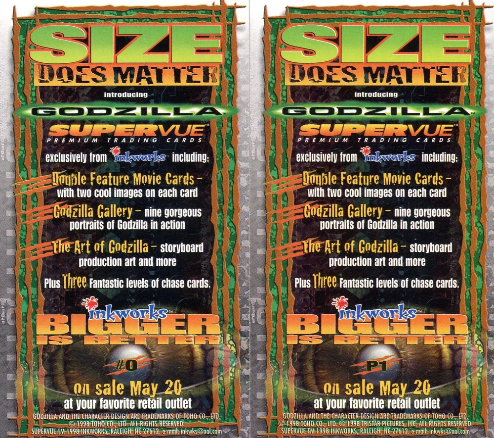 Description: Godzilla The Movie Supervue Widevision Size Does Matter Promo Card Lot Contents: 2 Size Does Matter Promo Cards (2 1/2" x 4 1/2" Widevision), O and P1. Manufacturer: Inkworks, 1998. Condi...