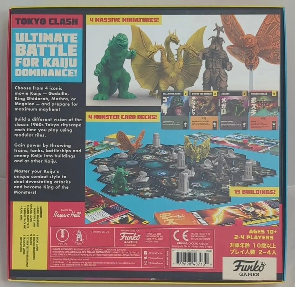 Immerse yourself in an epic battle between Kaiju monsters with the Godzilla Tokyo Clash Board Game. This exciting game includes cards, counters, and plastic action figures featuring fan-favorite characters such as King Ghidorah, Mothra, and Megalon. Made by Funko in 2021, this game is perfect for fans of strategy and action games aged 10+. Experience the thrill of battle as you command your chosen Kaiju and battle against your opponents. With its United States manufacturing, this game offers a high-quality gaming experience that will keep you entertained for hours. Get ready to become the ultimate Kaiju master with the Godzilla Tokyo Clash Board Game.