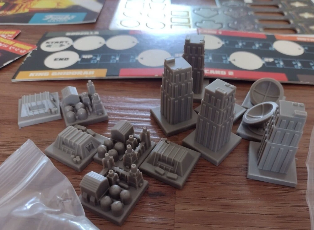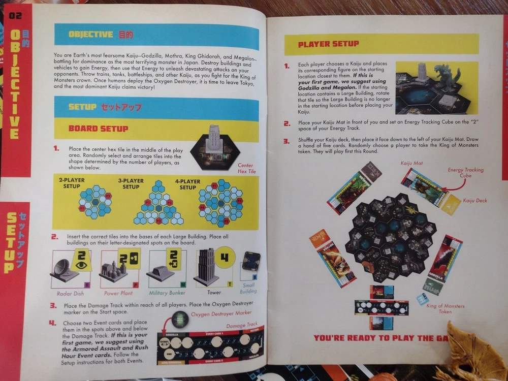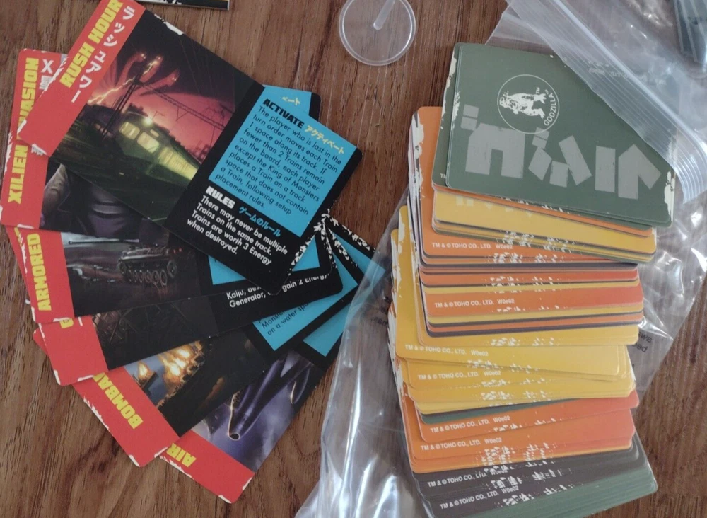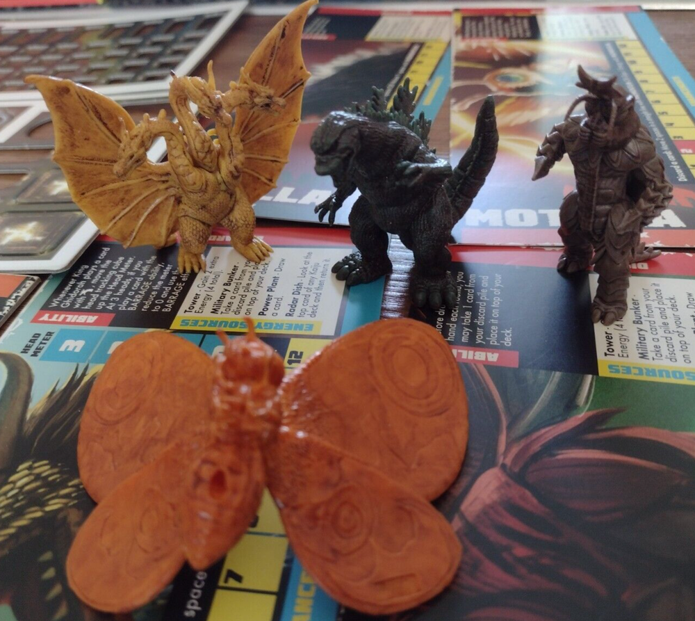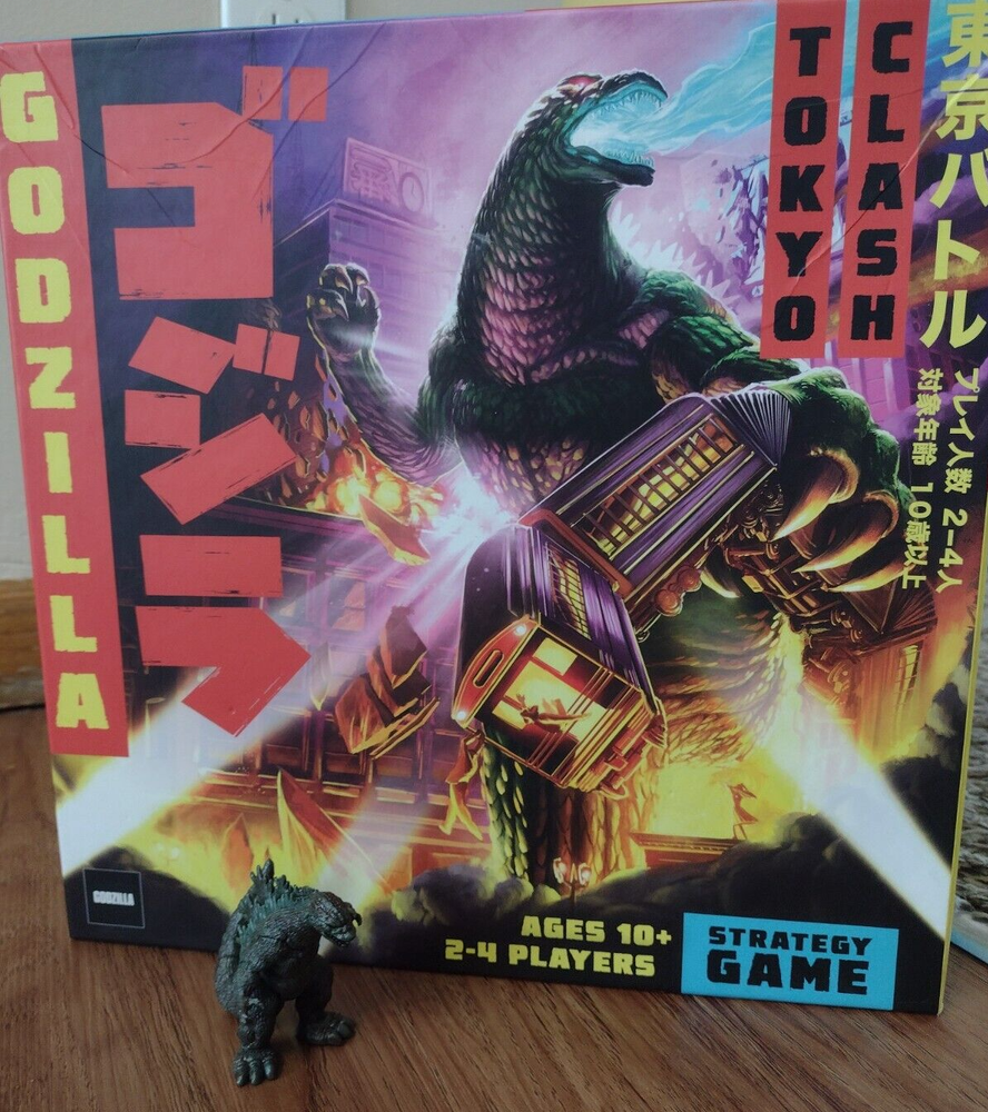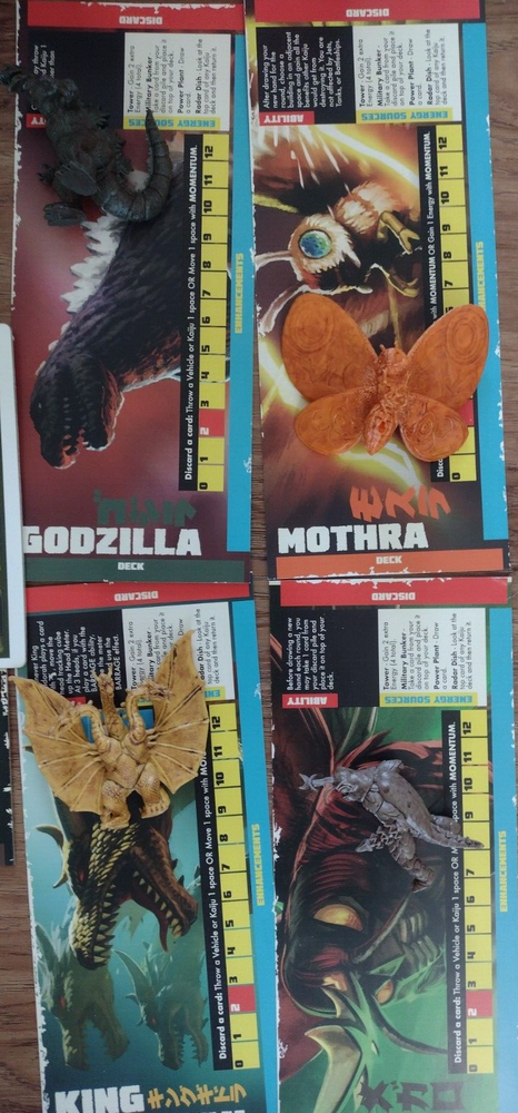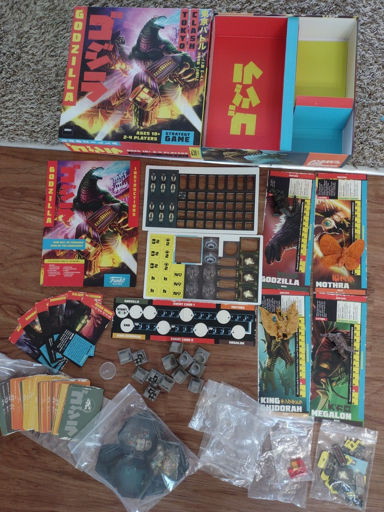 2-4 players Age 10+ Used, Very Good Condition The worn look on the cards is deliberate by the manufacturer Official description: In Godzilla: Tokyo Clash , you play as the Earth's most fearsome Kaiju — Godzilla, Mothra, King Ghidorah, and Megalon — battling for dominance as the most terrifying monster in Japan. With detailed miniatures of the legendary monsters and a modular cityscape of 3D buildings to destroy, it's an epic battle every time you play! In more detail, each player has their own deck of cards unique to the kaiju they control. As you throw trains and tanks at the opponents and attack them directly to cause damage, you can burn cards out of their deck, reducing their options on future turns. As you stomp through the city, you can earn energy, which can help you lay out permanent enhancements to your abilities.