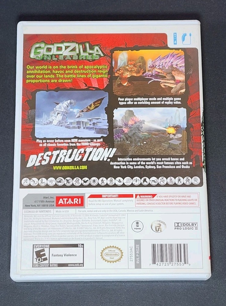 Manual is a little rough otherwise the game is complete and in nice shape. "Godzilla: Unleashed" for Nintendo Wii, released in 2007 by Atari Inc., is an action-packed video game that allows players to take on the role of the iconic monster, Godzilla. With a rating of E10+ (Everyone 10+), this game offers exciting gameplay and adventure for fans of all ages. Additionally, the game includes a manual for easy navigation and understanding. Join Godzilla on his quest for destruction and domination in this thrilling gaming experience.