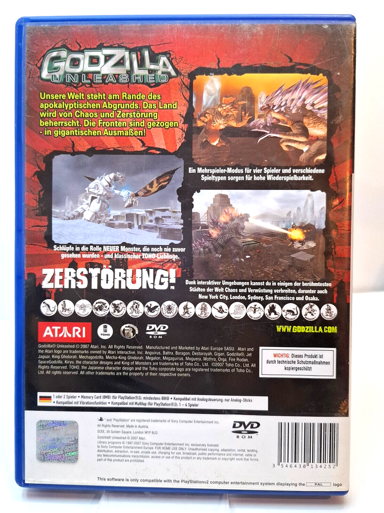 Godzilla Unleashed - PS2 - Sony PLAYSTATION 2 Game Boxed - Pal - Atari The description of this item has been automatically translated. If you have any questions, please feel free to contact us. - NOTE: used games CD + original packaging + instructions (if applicable. on CD) - Text on the back of the packaging mostly in German or English - Fully functional and tested used goods from the specialist dealer in Lübeck - Has normal age-related wear - The language in the game is mostly English or German. - Shipping from 23554 Lübeck/Germany, item in stock - We have a great selection in our Ebay shop - Customer service is very important to us. - We have a team of friendly staff who are happy to help you. - You can reach us from Monday to Friday from 10 a.m. to 5 p.m - Our customer service is not available on weekends and public holidays - The invoicing for this article is carried out using differential taxation in accordance with Section 25a UStG. (It is therefore not possible to show sales tax). - NOTE: used games CD + original packaging + instructions (if applicable. on CD) - Text on the back of the packaging mostly in German or English - Fully functional and tested used goods from the specialist dealer in Lübeck - Has normal age-related wear - The language in the game is mostly English or German. - Shipping from 23554 Lübeck/Germany, item in stock - We have a great selection in our Ebay shop - Customer service is very important to us. - We have a team of friendly staff who are happy to help you. - You can reach us from Monday to Friday from 10 a.m. to 5 p.m - Our customer service is not available on weekends and public holidays - The invoicing for this article is carried out using differential taxation in accordance with Section 25a UStG. (It is therefore not possible to show s Marke Sony Besonderheiten Mit Anleitung und Verpackung Regionalcode PAL Herausgeber USK-Einstufung USK ab 12 Jahren Genre Action & Abenteuer Plattform Sony PlayStation 2 Spielname Godzilla: Unleashed EAN 3546430134252