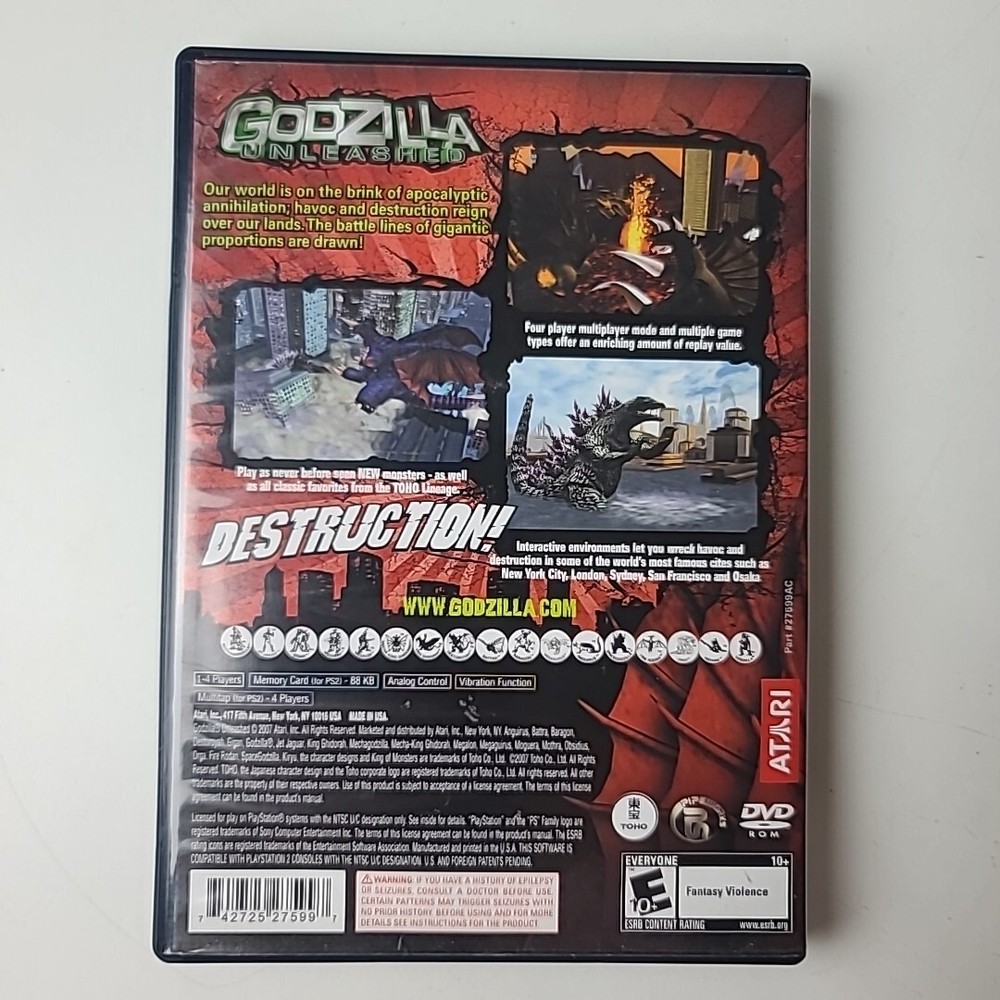 Immerse yourself in the thrilling world of Godzilla with this action-packed game, Godzilla: Unleashed for the Sony PlayStation 2. Released in 2007, this game promises to keep players on the edge of their seats with its exciting gameplay and stunning graphics. With a rating of E10+, it's suitable for players of all ages. The game is complete in box (CIB) and has been thoroughly tested to ensure that it's in working condition. This is a great addition to any gamer's collection, and with its action and adventure genre, it's sure to provide hours of entertainment. Get ready to experience the ultimate battle of the giants with Godzilla: Unleashed. The disc does have some light scratches. the game still plays perfectly. Will be shipped in a box for safety. The photos are of the actual item being sold. The t.v. and the PS2 are NOT INCLUDED in this sale.