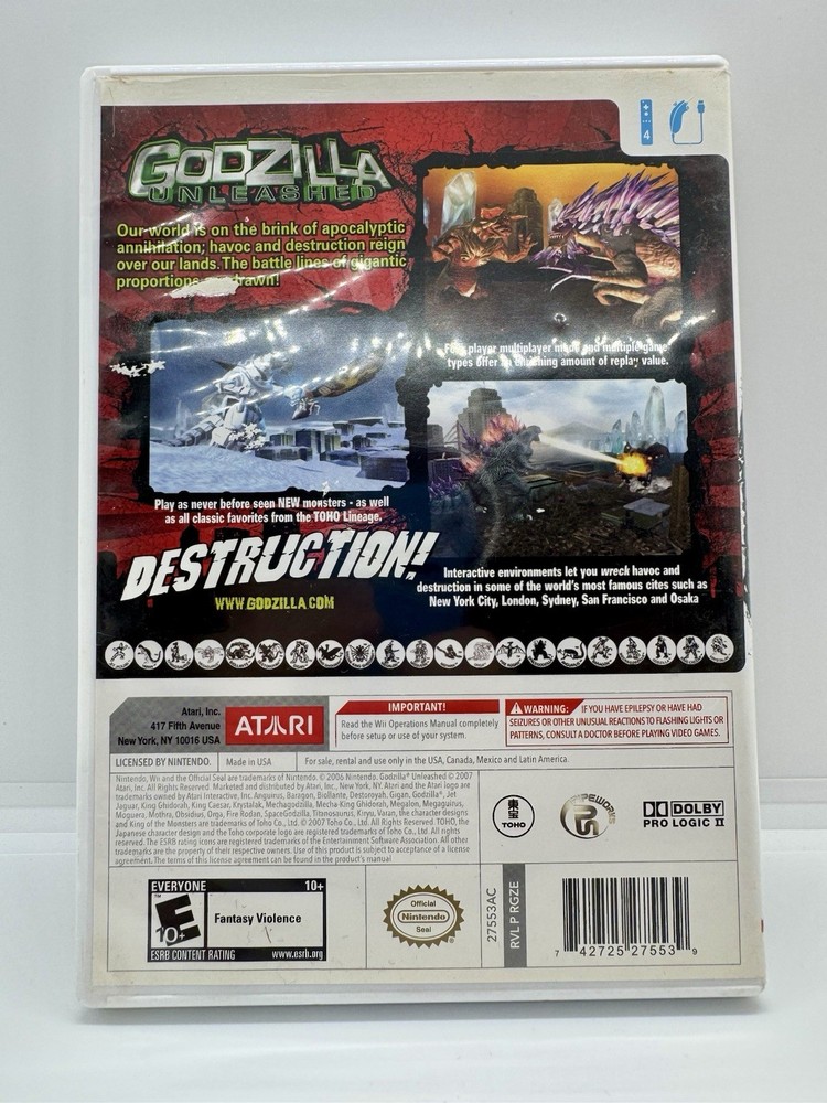 Embark on a monstrous adventure with "Godzilla: Unleashed" for the Nintendo Wii. Released in 2007, this action-packed game invites players to unleash the king of monsters in a variety of destruction-filled arenas. Rated E10+ for Everyone 10 and older, it promises a thrilling experience for gamers who enjoy action and adventure genres. The game comes with an original case and includes the manual, though the front page is missing. It has been tested and is confirmed to be in working order. Dive into the chaos with NTSC-U/C region coding, ensuring compatibility with systems in the US and Canada. This title is a must-have for fans of the franchise and those looking for a giant-sized challenge.