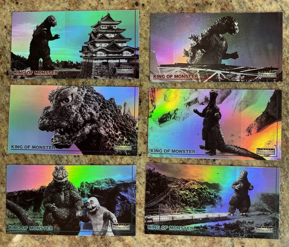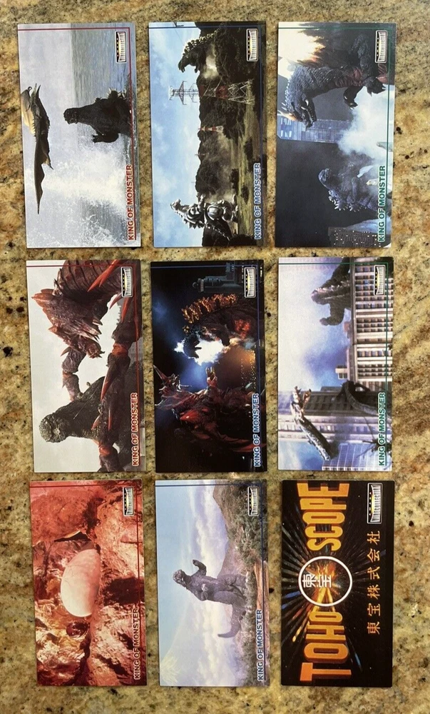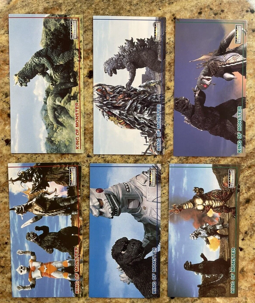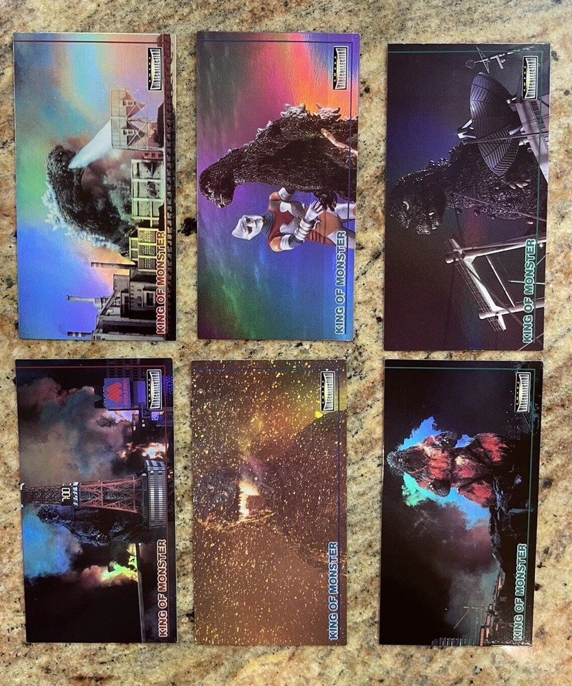 Complete set of 75 different "widevision" wide collection cards featuring Godzilla and other characters! This set was produced in Japan and is a phenomenal set to own. Buyer will also receive, in addition to the complete set, a wrapper as well from the set. The first 12 cards in the set are unique foil cards and truly add to the magnificence of the set. Extremely hard to find as a complete set as most of these have been broken up and you can find singles listed on ebay from $10 to $25 each...here's your chance to get them all!! Thanks for looking!!