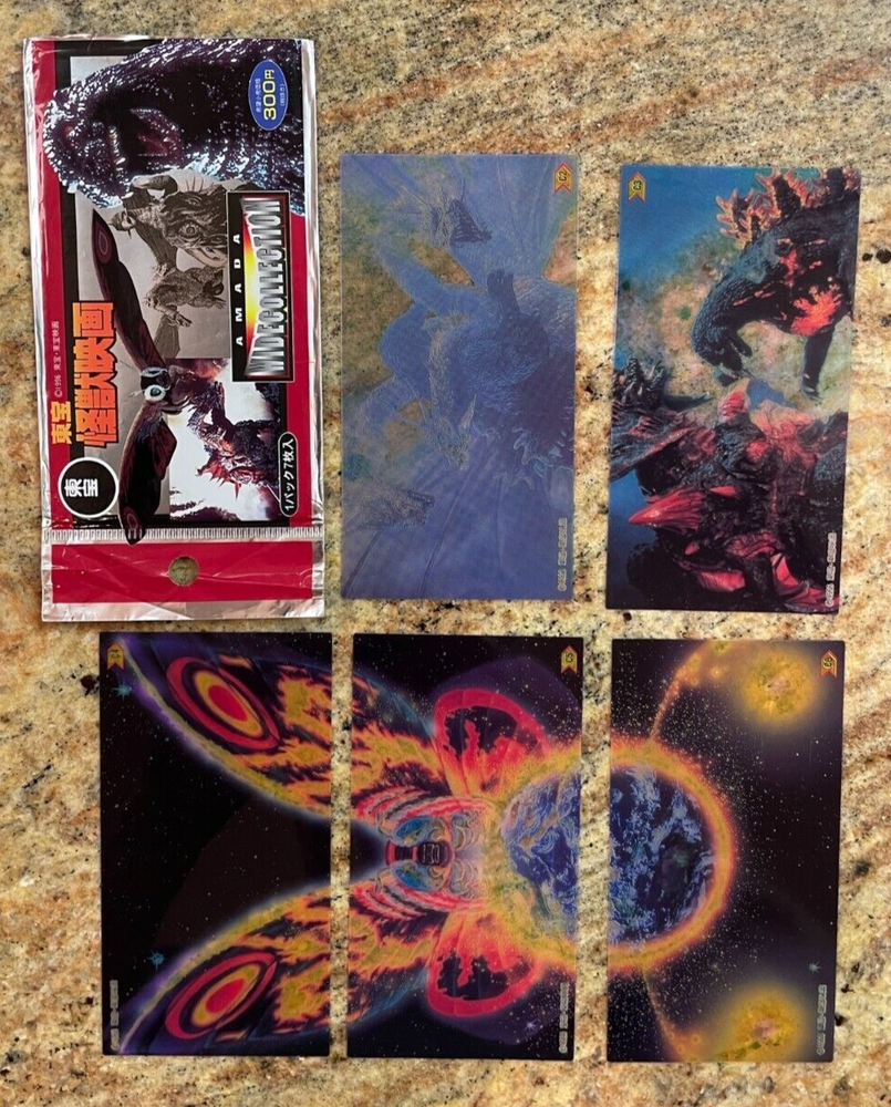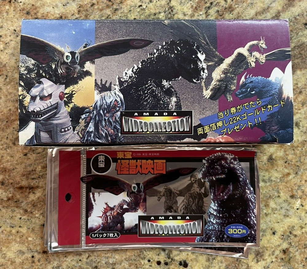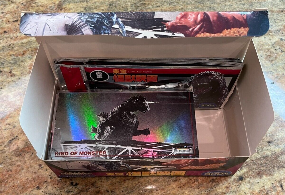 Near MASTER set of 75 different "widevision" wide collection cards plus 5 of the 6 clear plastic inserts featuring Godzilla and other characters! This set was produced in Japan and is a phenomenal set to own. Buyer will also receive, in addition to the complete set and 5/6 inserts, a wrapper AND THE ORIGINAL BOX as well from the set. The first 12 cards in the set are unique foil cards and truly add to the magnificence of the set. Extremely hard to find as a complete set as most of these have been broken up and you can find singles listed on ebay from $10 to $25 each...here's your chance to get them all!! Thanks for looking!!