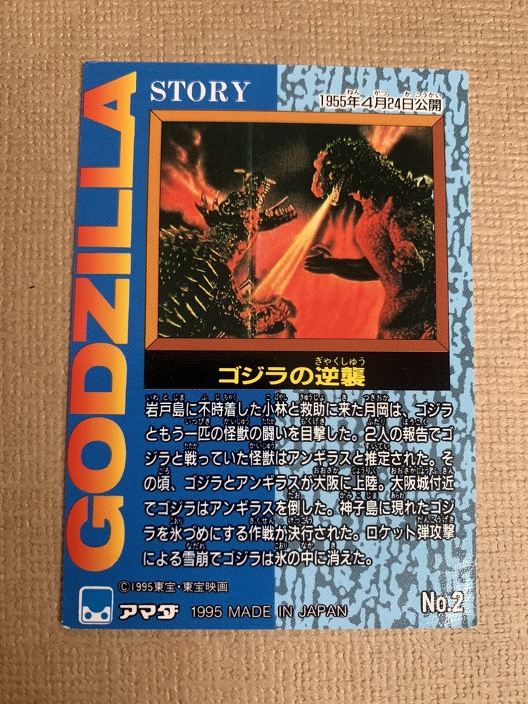 '' Godzilla card Godzilla's counterattack AMADA no.2 '' Description Grade: used It is a used item. Everything in the picture is. Condition is Good. Please check the condition with the photo. Payment We accept PayPal only. Payment is due within 3 days of the auction end. We will ship the item 3 business days after your payment clears. Shipping I send a product by Air Mail. no traking Will be shipped by Japan Post Shipping is only available to the address registered in Paypal. Please note that any address not registered in Paypal is not acceptable to ship. Shipping is available from Monday to Friday. Weekends are not available because post office is closed. Returns Unconditional Return Policy Customer service and satisfaction are very important to us. I have an unconditional return policy if notified within 14 of the receipt of the item. All returned items must be the original condition. All return requests must be made within 14 days of the receipt of the item. Please contact me first for return before you ship it back to me. The postage of the returned goods is a buyer burden. < International Buyers Please Note : Import duties, taxes, and charges are not included in the item price or shipping cost. These charges are the buyer's responsibility. Please check with your country's customs office to determine what these additional costs will be prior to bidding or buying.