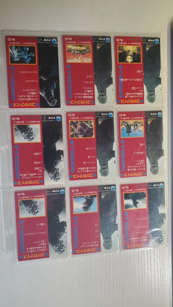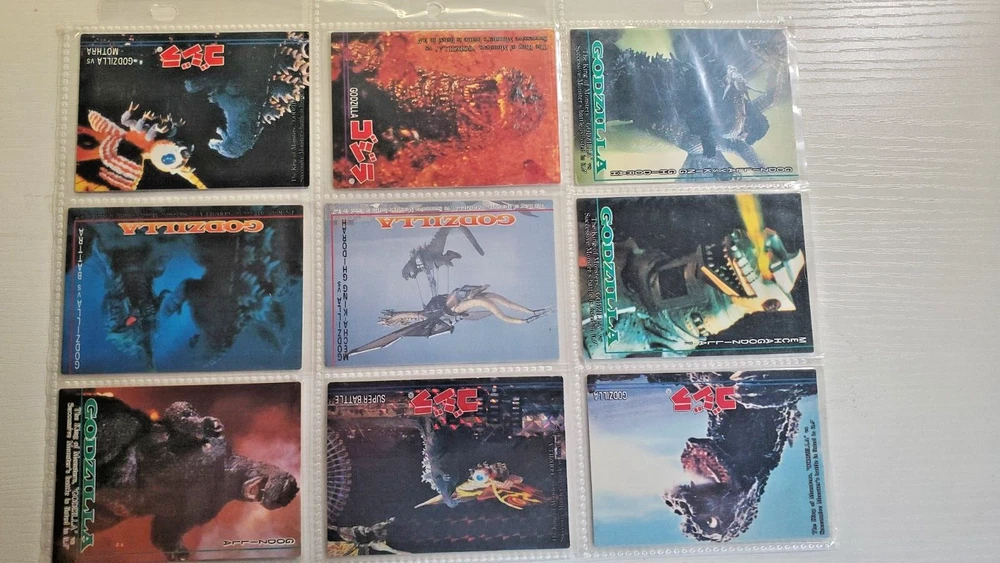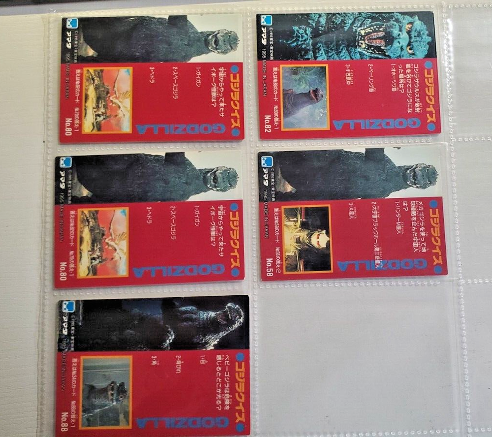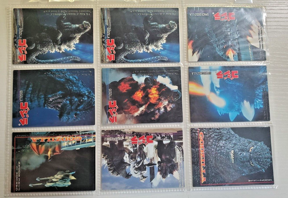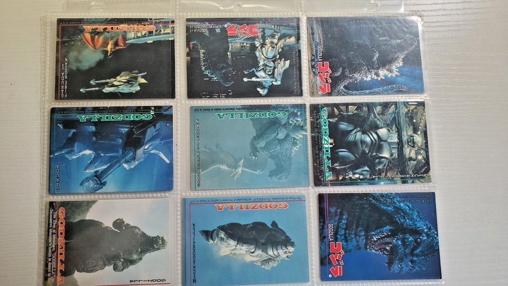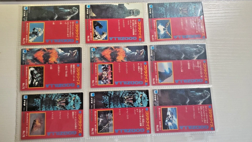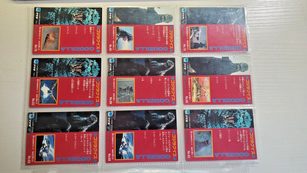 The product is a set of 23 vintage Japanese AMADA cards featuring Godzilla. Manufactured in 1995 in Japan, these paper cards are part of the Godzilla franchise. They are in Japanese language and are not signed. The brand associated with these cards is AMADA.