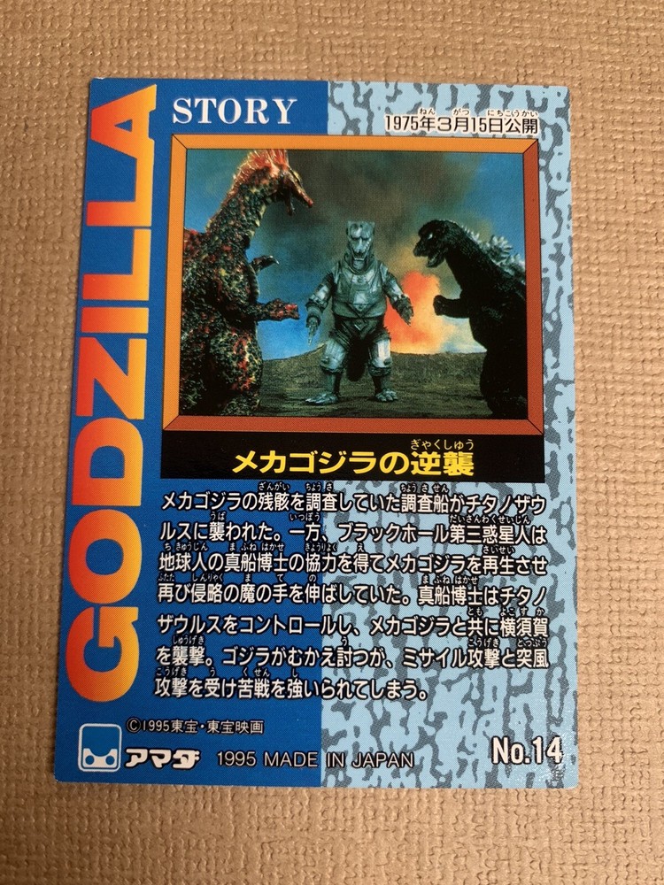 '' Godzilla card Mechagodzilla's counterattack AMADA no.14 '' Description Grade: used It is a used item. Everything in the picture is. Condition is Good. Please check the condition with the photo. Payment We accept PayPal only. Payment is due within 3 days of the auction end. We will ship the item 3 business days after your payment clears. Shipping I send a product by Air Mail. no traking Will be shipped by Japan Post Shipping is only available to the address registered in Paypal. Please note that any address not registered in Paypal is not acceptable to ship. Shipping is available from Monday to Friday. Weekends are not available because post office is closed. Returns Unconditional Return Policy Customer service and satisfaction are very important to us. I have an unconditional return policy if notified within 14 of the receipt of the item. All returned items must be the original condition. All return requests must be made within 14 days of the receipt of the item. Please contact me first for return before you ship it back to me. The postage of the returned goods is a buyer burden. < International Buyers Please Note : Import duties, taxes, and charges are not included in the item price or shipping cost. These charges are the buyer's responsibility. Please check with your country's customs office to determine what these additional costs will be prior to bidding or buying.
