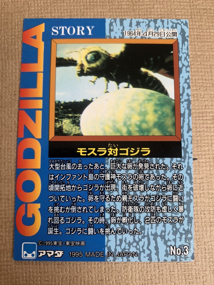'' Godzilla card Mothra VS Godzilla AMADA no.3 '' Description Grade: used It is a used item. Everything in the picture is. Condition is Good. Please check the condition with the photo. Payment We accept PayPal only. Payment is due within 3 days of the auction end. We will ship the item 3 business days after your payment clears. Shipping I send a product by Air Mail. no traking Will be shipped by Japan Post Shipping is only available to the address registered in Paypal. Please note that any address not registered in Paypal is not acceptable to ship. Shipping is available from Monday to Friday. Weekends are not available because post office is closed. Returns Unconditional Return Policy Customer service and satisfaction are very important to us. I have an unconditional return policy if notified within 14 of the receipt of the item. All returned items must be the original condition. All return requests must be made within 14 days of the receipt of the item. Please contact me first for return before you ship it back to me. The postage of the returned goods is a buyer burden. < International Buyers Please Note : Import duties, taxes, and charges are not included in the item price or shipping cost. These charges are the buyer's responsibility. Please check with your country's customs office to determine what these additional costs will be prior to bidding or buying.