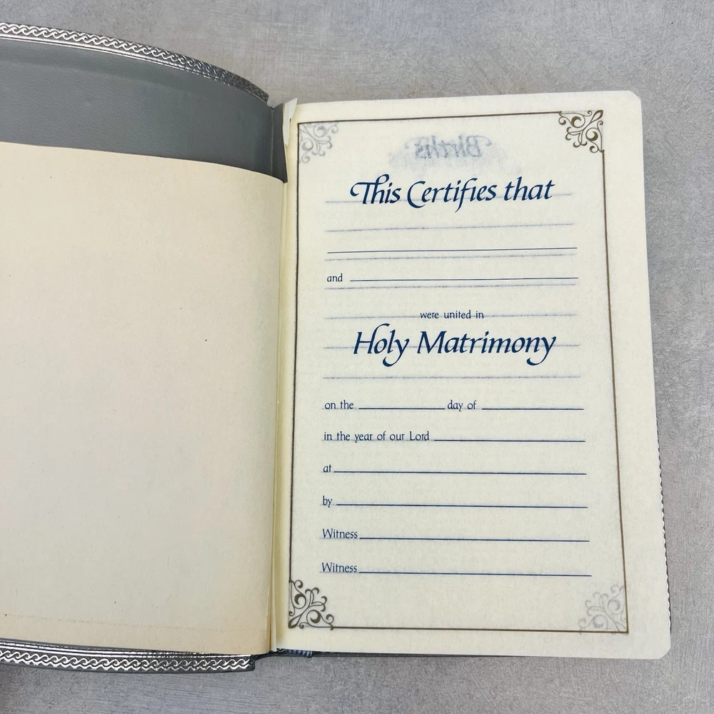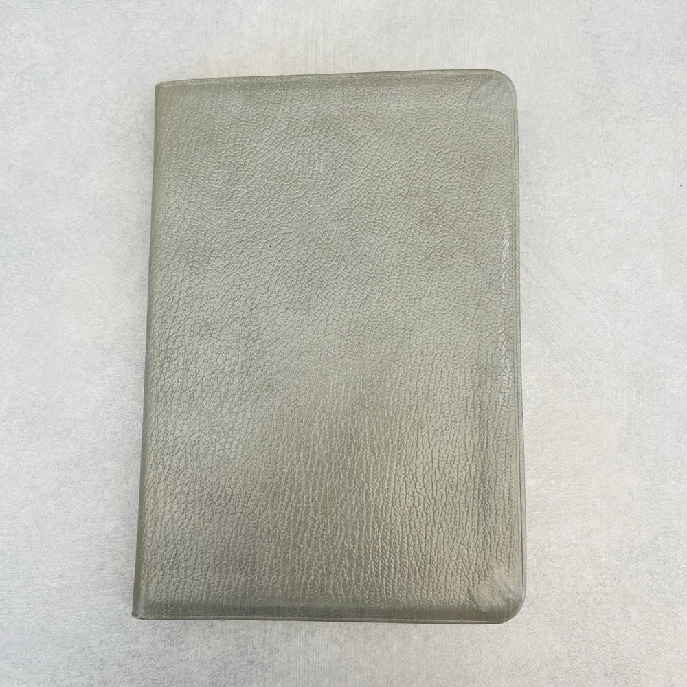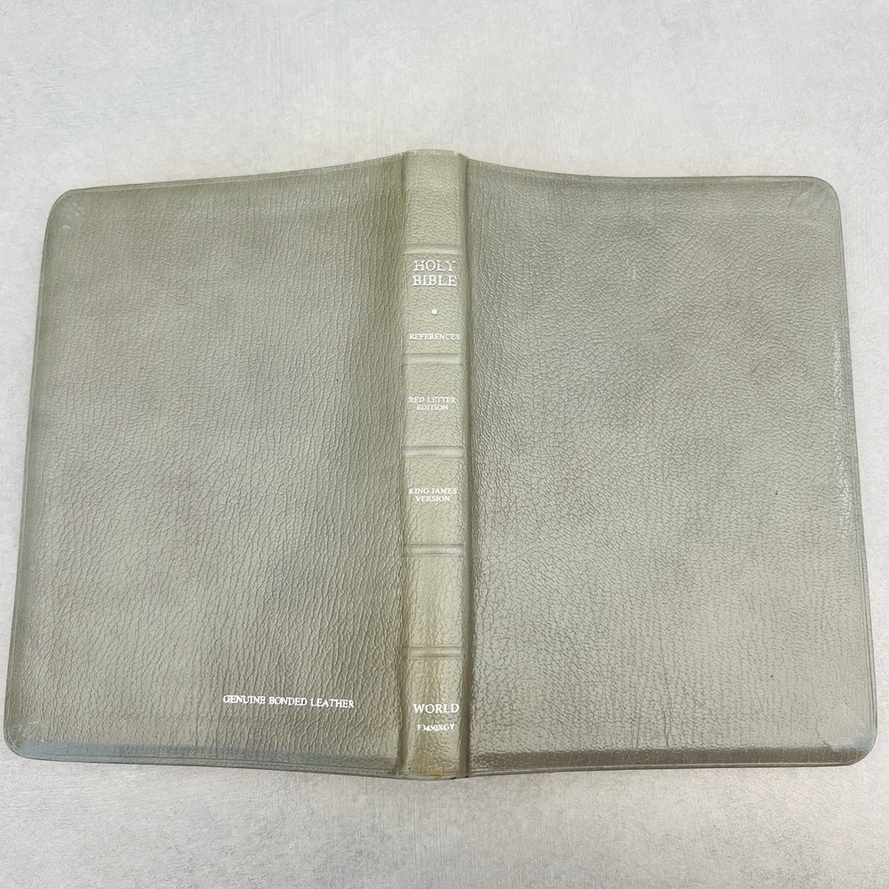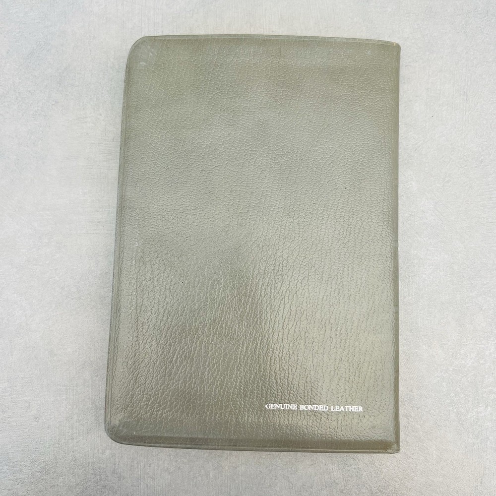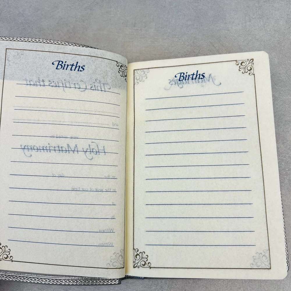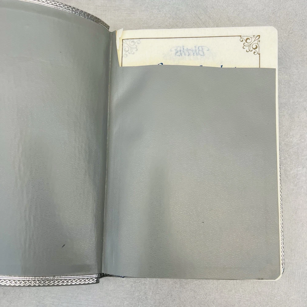 First page has a piece missing at the top. Seems to be missing some of the blank pages. Genuine bonded leather. Has births, marriages, deaths section. Some wear on edges and corners.
