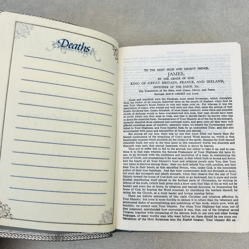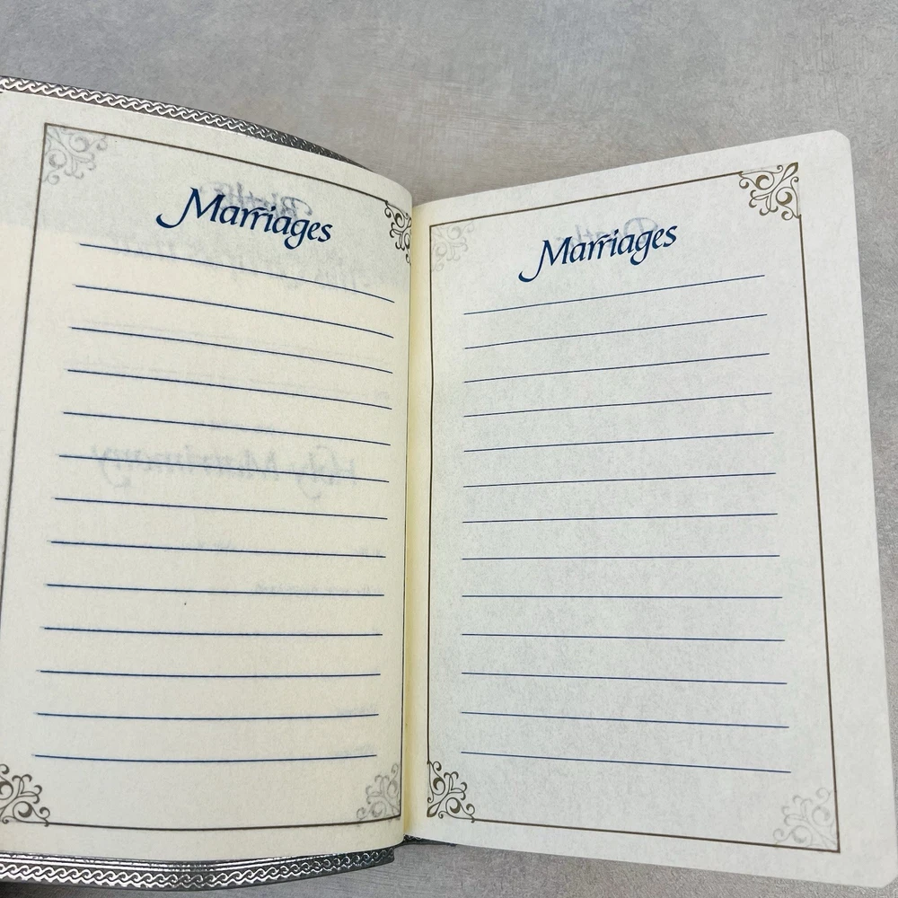 First page has a piece missing at the top. Seems to be missing some of the blank pages. Genuine bonded leather. Has births, marriages, deaths section. Some wear on edges and corners....