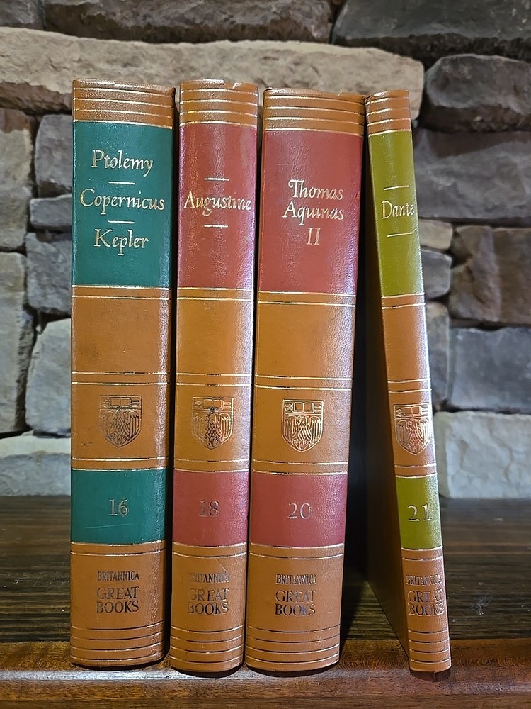 Great Books of the Western World Copyright 1952 Volumes 16, 18, 20 & 21 Encyclopedia Britannica Includes: Volume 16: Ptolemy, Copernicus, Kepler Volume 18: Augustine Volume 20: Thomas Aquinas II Volume 21: Dante Always check out photos for more info on details I AM NOT A PHOTOGRAPHER! Please check out my other sales. Most items I get came from yard sales, Goodwill/Thrift stores and Auctions. I try to list any flaws I see. I definitely am not perfect. If I miss anything of MAJOR proportions, I will definitely make it right. Please note, all of these items are used unless noted. I like to say · I know a lot about a little · I know a little about a lot · I know Everything about NOTHING!