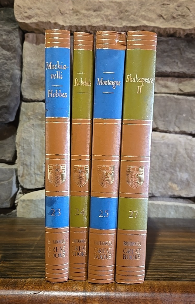 Great Books of the Western World Copyright 1952 Volumes 23, 24, 25, & 27 Encyclopedia Britannica Includes: Volume 23: Machiavelli, Hobbes Volume 24: Rabelais Volume 25: Montaigne Volume 27: Shakespeare II Always check out photos for more info on details I AM NOT A PHOTOGRAPHER! Please check out my other sales. Most items I get came from yard sales, Goodwill/Thrift stores and Auctions. I try to list any flaws I see. I definitely am not perfect. If I miss anything of MAJOR proportions, I will definitely make it right. Please note, all of these items are used unless noted. I like to say · I know a lot about a little · I know a little about a lot · I know Everything about NOTHING!