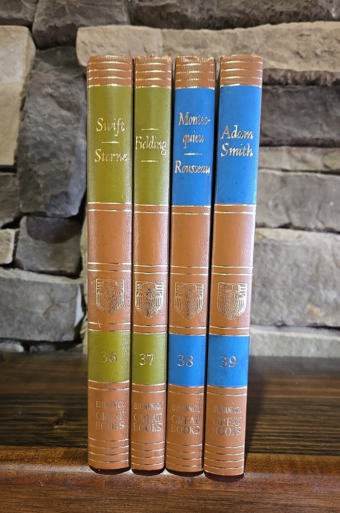 Great Books of the Western World Copyright 1952 Volumes 36, 37, 38, & 39 Encyclopedia Britannica Includes: Volume 36: Swift, Sterne Volume 37: Fielding Volume 38: Montesquieu, Rousseau Volume 39: Adam Smith Always check out photos for more info on details I AM NOT A PHOTOGRAPHER! Please check out my other sales. Most items I get came from yard sales, Goodwill/Thrift stores and Auctions. I try to list any flaws I see. I definitely am not perfect. If I miss anything of MAJOR proportions, I will definitely make it right. Please note, all of these items are used unless noted. I like to say · I know a lot about a little · I know a little about a lot · I know Everything about NOTHING!